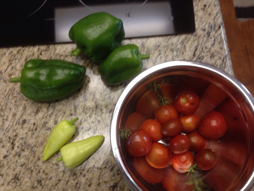 When I returned from the UK mid-week, I headed out to check the garden. Despite the heat, we are getting some success. I’ve been enjoying fresh tomatoes and peppers in my lunches. And I don’t even have to share!