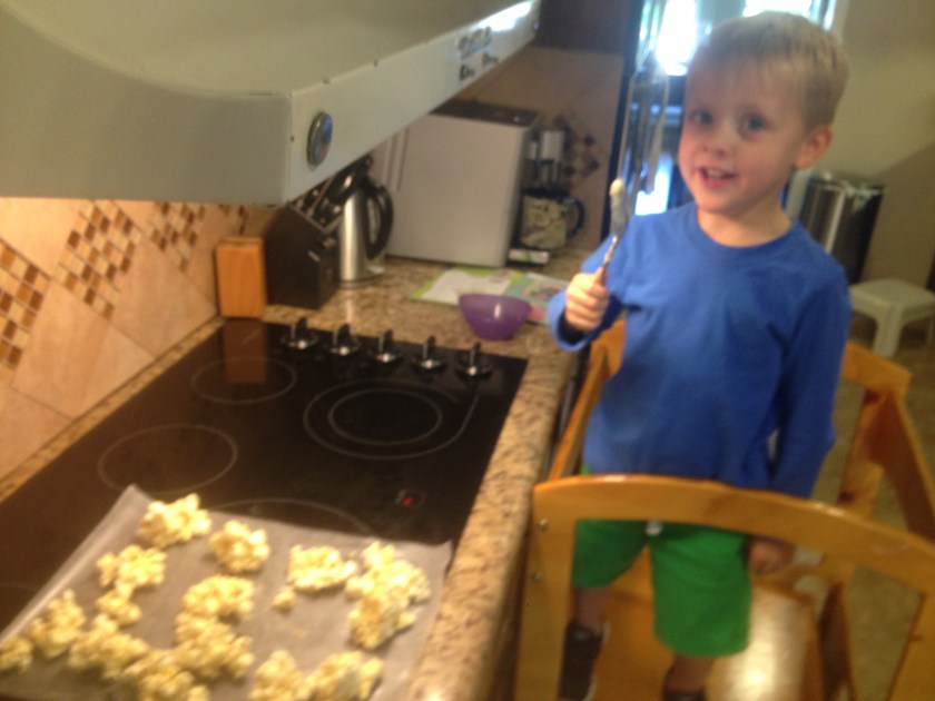 Colin made a tasty treat for a snack today – it’s coral made of popcorn! The popcorn is held together with marshmallows, like Rice Krispie squares, and both kids are enjoying it. He also helped make pumpkin-soy muffins. It was a busy afternoon in the kitchen!