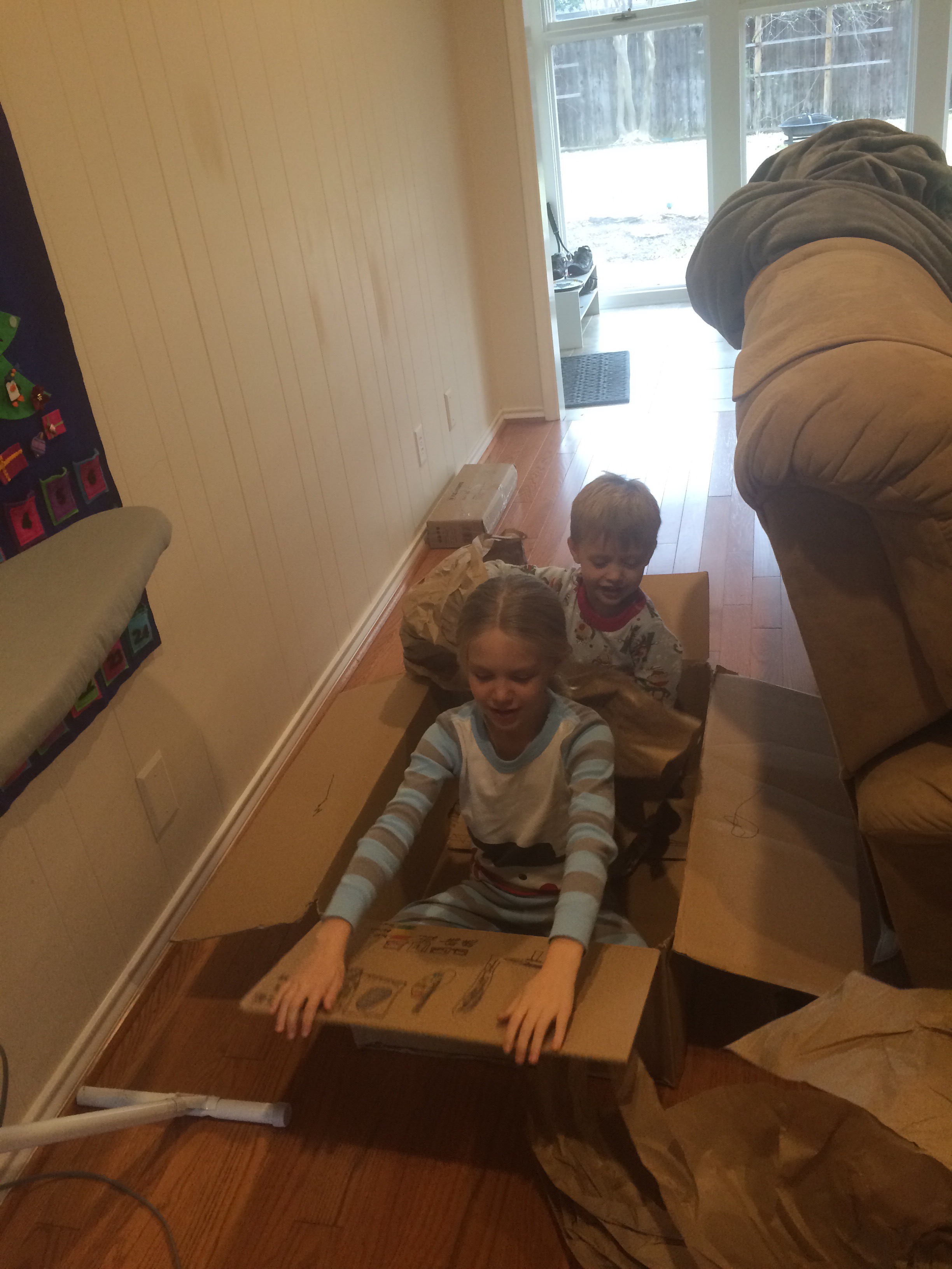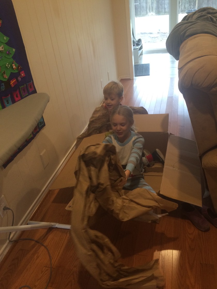A box! I am questioning why we bought them toys for Christmas… The box quickly became an airplane. Clouds came along and interfered with the flying. Share this: Share on X (Opens in new window) X Share on Facebook (Opens in new window) Facebook Like Loading... Related