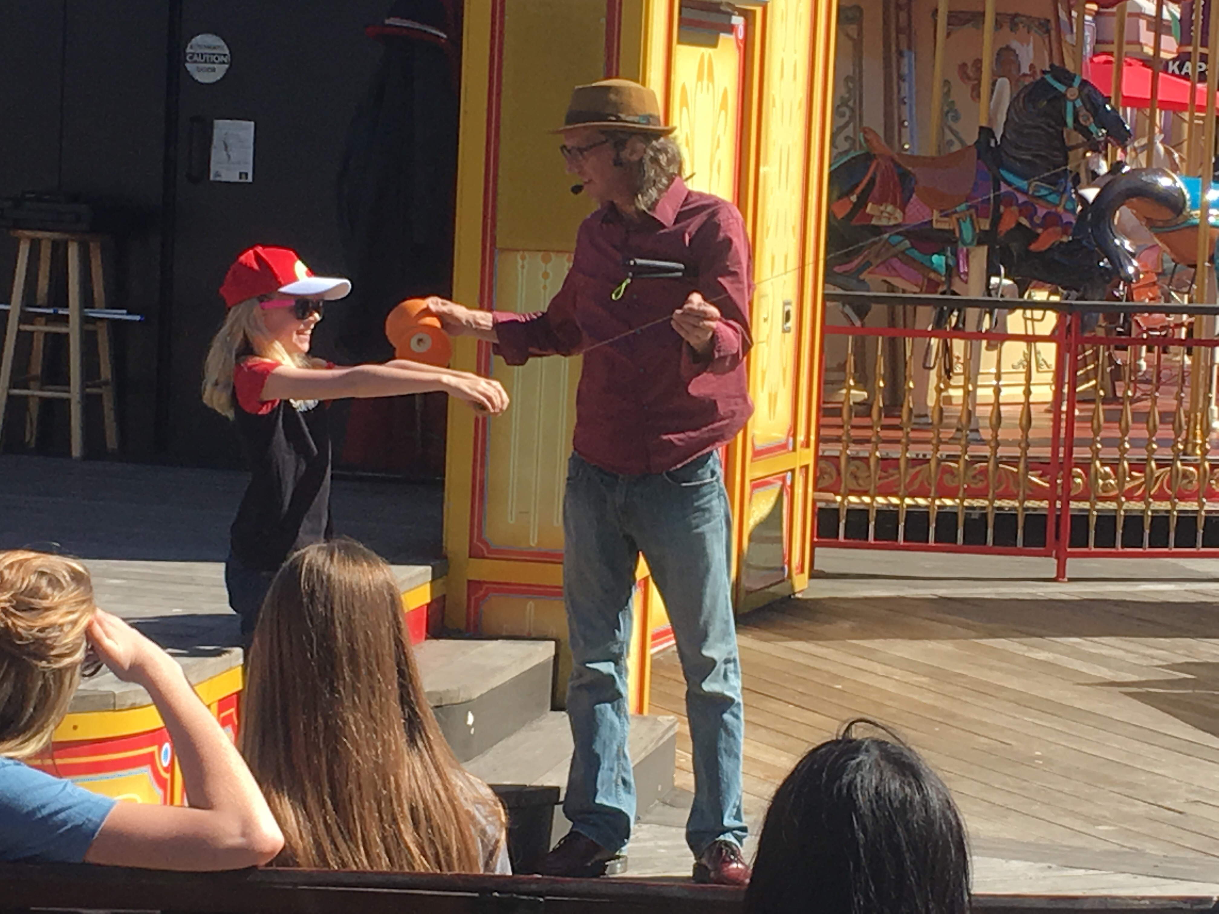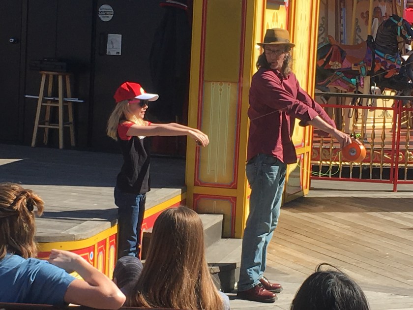 Laura in a street show Laura was excited to be chosen to help out with a juggling street performance. The video below is the second, and successful, attempt at the trick. In the first try the diablo spinner wasn’t caught after Laura flicked it over her head. img_1174 Share this: Click to share on X (Opens in new window) X Click to share on Facebook (Opens in new window) Facebook Like Loading... Related