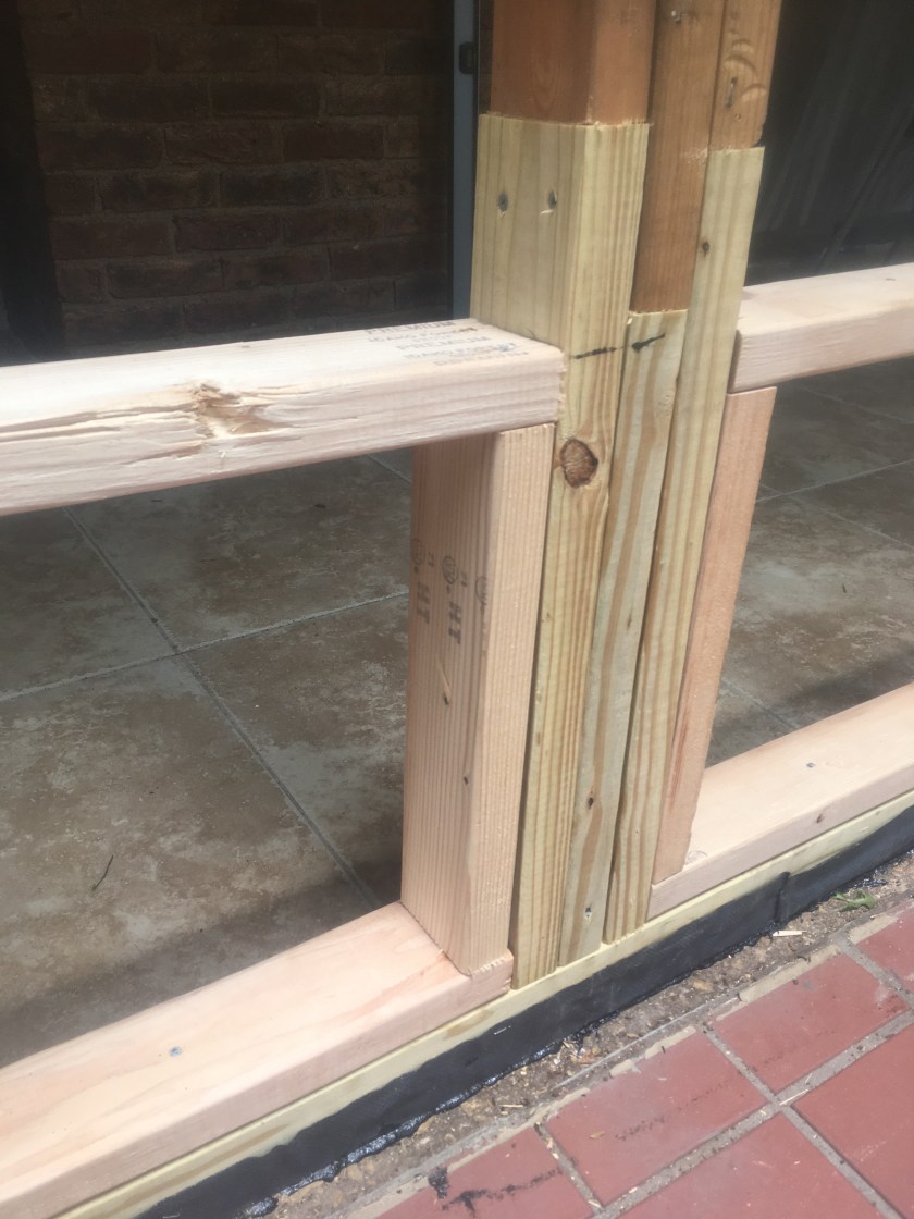This week, while Ken and Margaret have been here to help, we have rebuilt the wall ready for new windows. It turns out it was so rotten that the panes of glass that were there were what was holding up the wall.