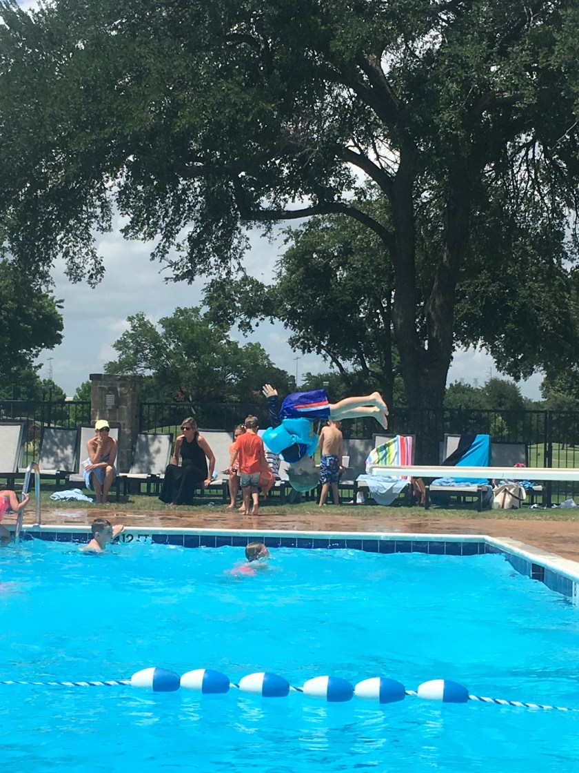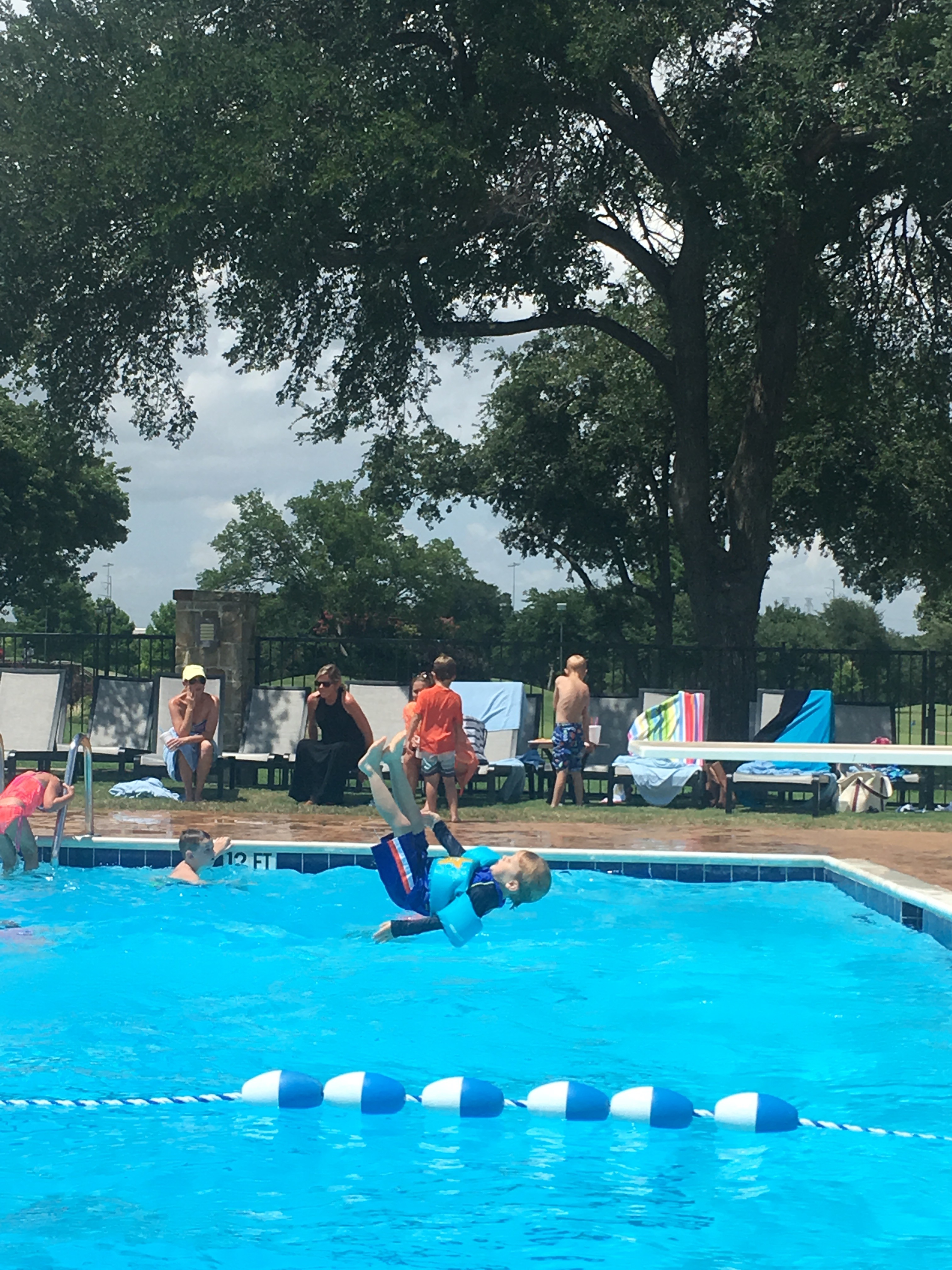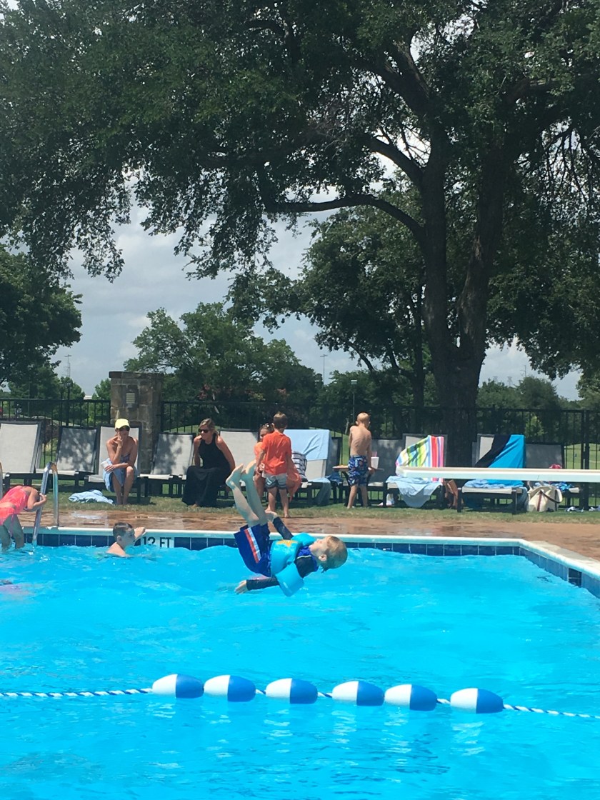 Colin off the diving board. We went with friends to the pool today. Colin was allowed on the diving board with his floaty on. Of course this meant he could practice front flips off the board! Share this: Click to share on X (Opens in new window) X Click to share on Facebook (Opens in new window) Facebook Like Loading... Related