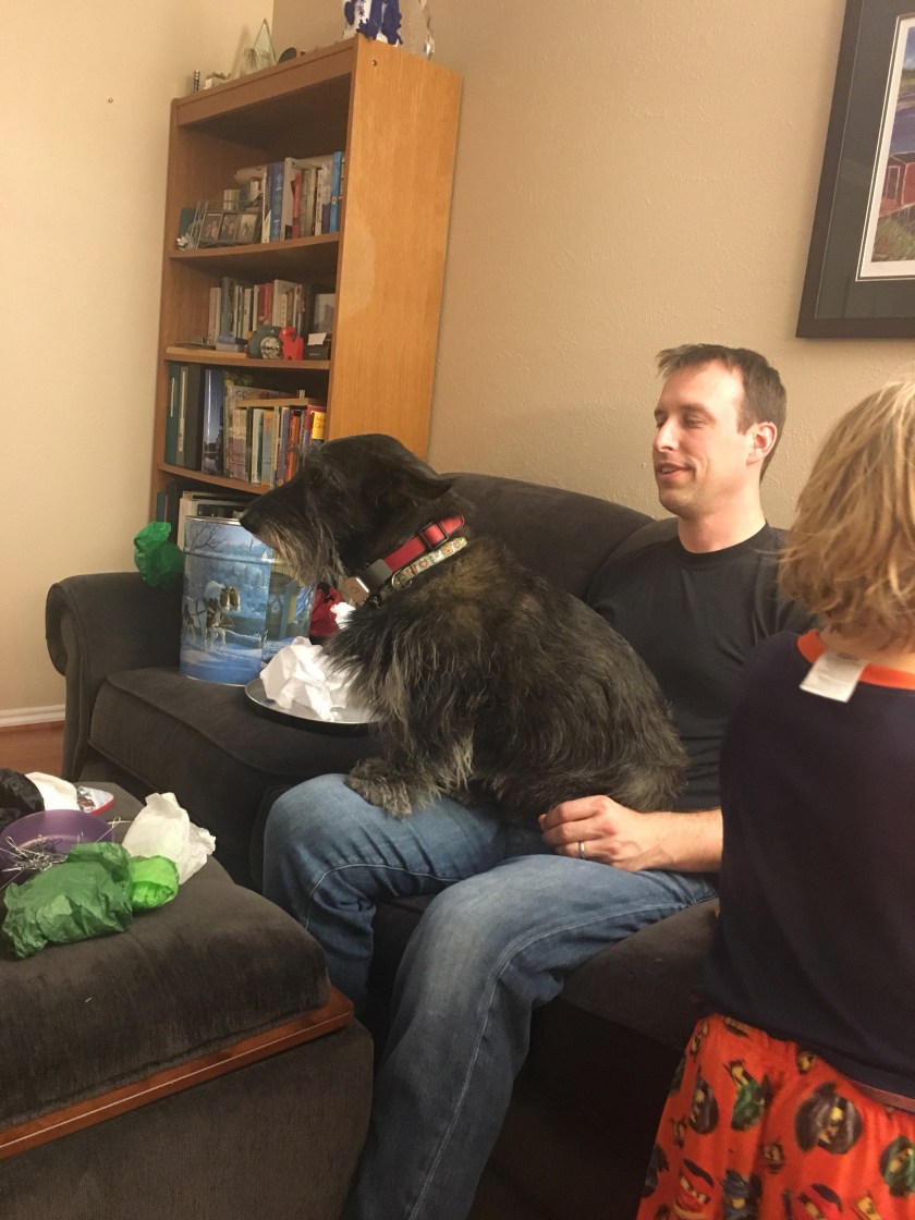 MacDougall was determined to be a part of it. Lucky for him, Cliff’s hip was sore and he just wanted to sit on the couch. It still might have been easier not to have a dog directly on top of him.