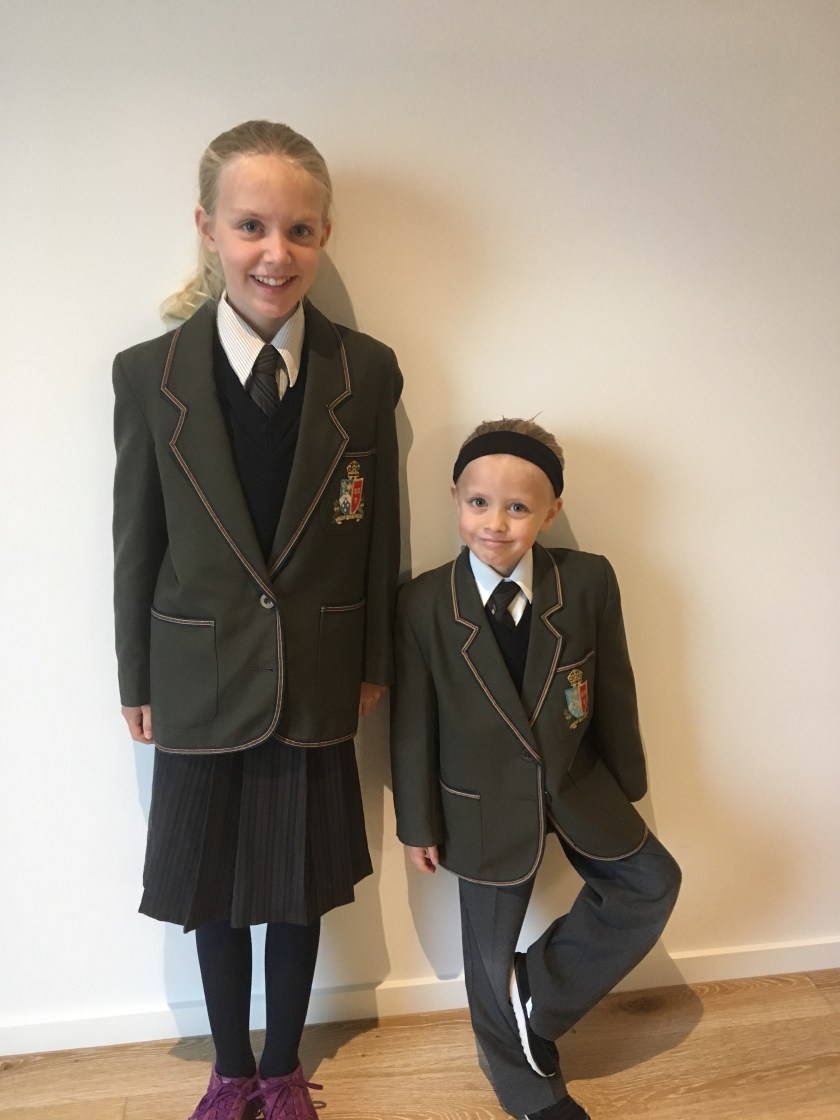 The kids fit in at school now! This was taken on Friday, and today we got them the right shoes, too.