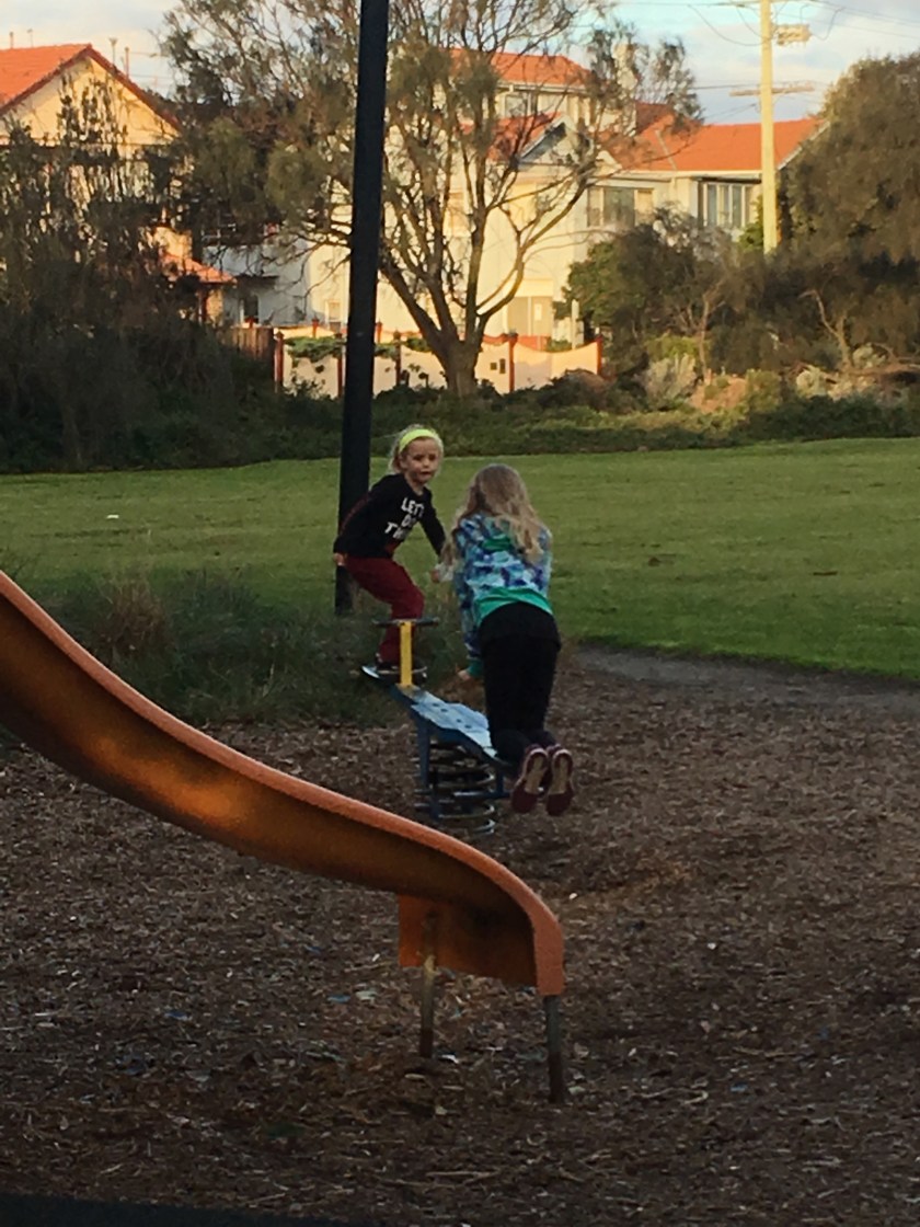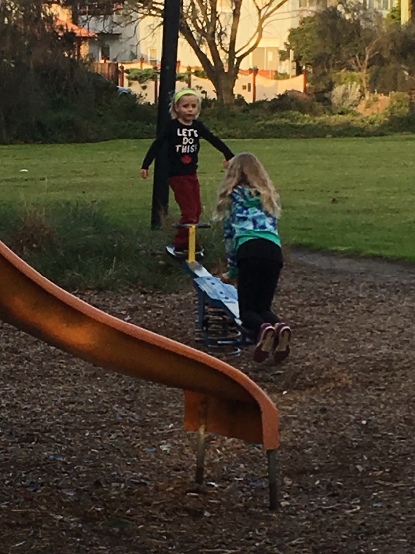 How to make the playground more challenging? Stand on the spring teeter totter while your sister bounces the other end.
