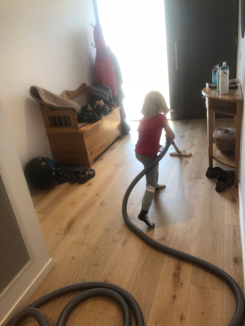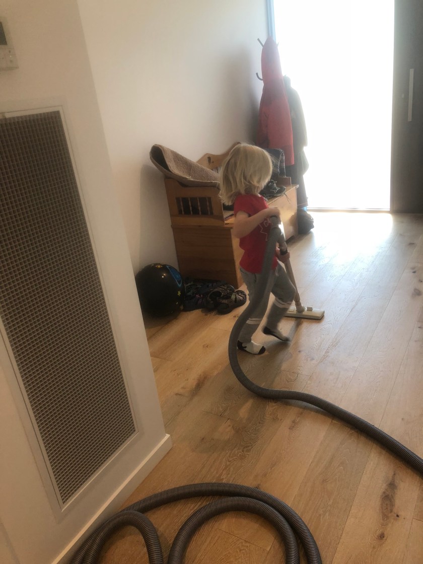 He picked up all the toys in the backyard, took out the trash, cleaned up the dining room table and set it for lunch, polished his shoes, helped Daddy in the garage, and did some vacuuming. I think he was glad he had some cash, or he would have had to do even more!