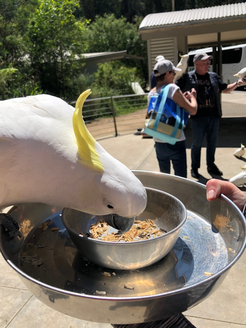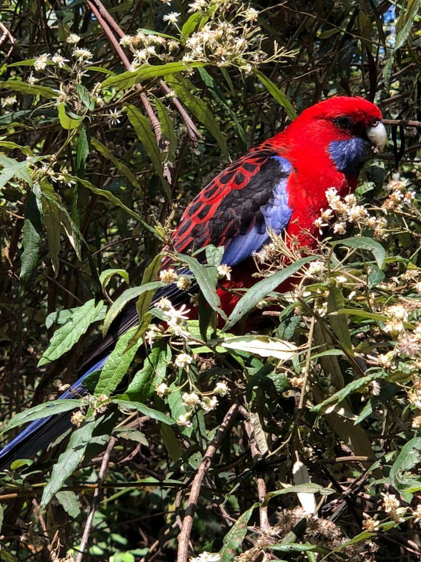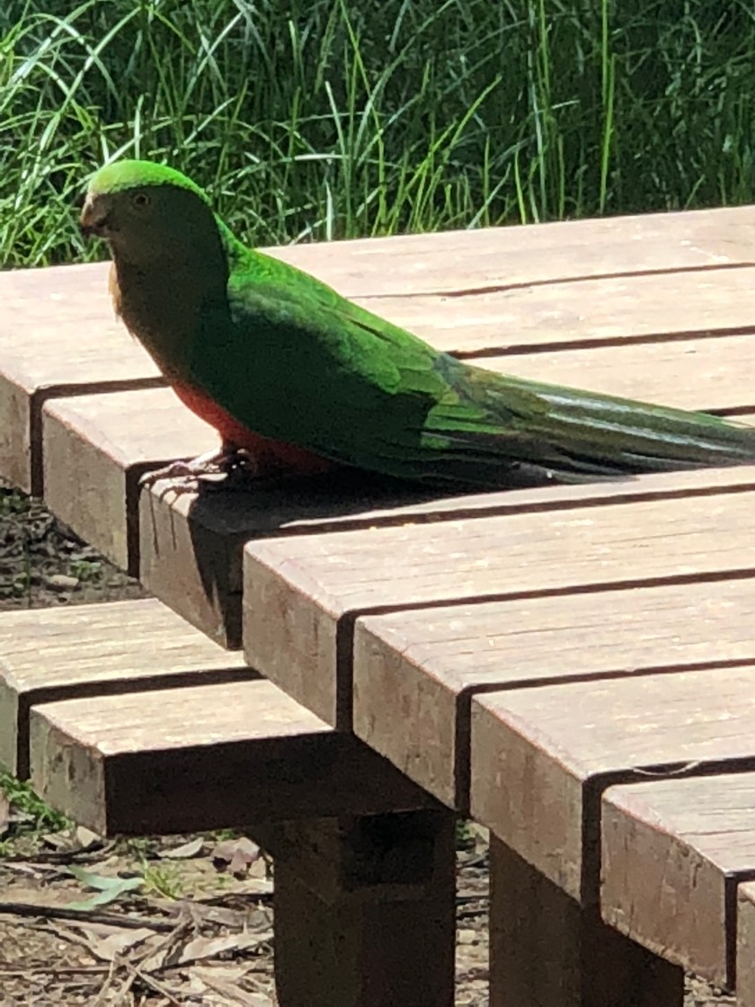 In addition to the cockatoos, we saw lots of corellas and crimson rosellas, and we saw our first king parrot. This one is a female – the males have bright red heads.