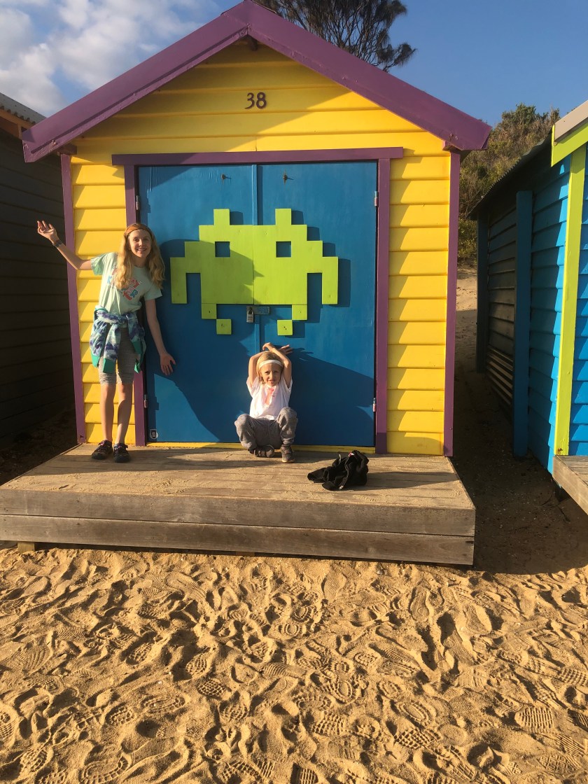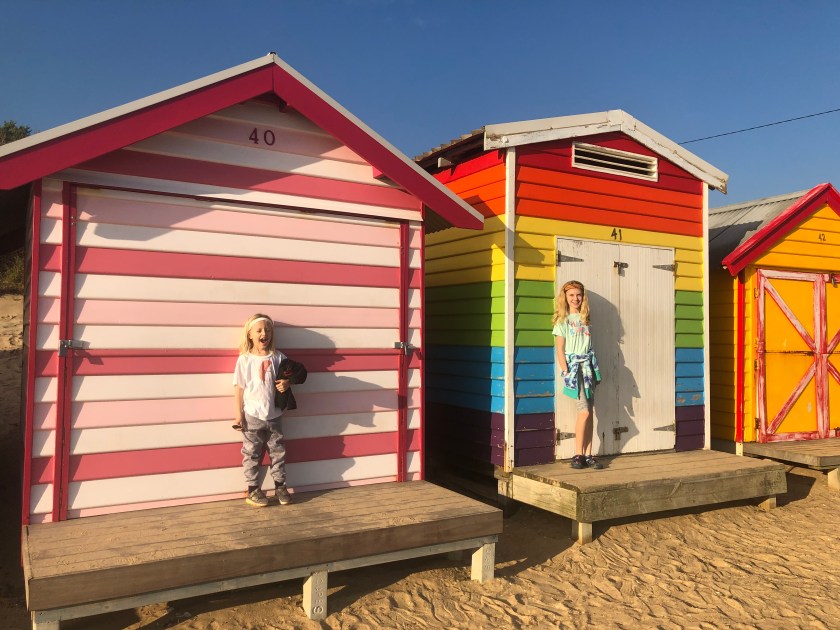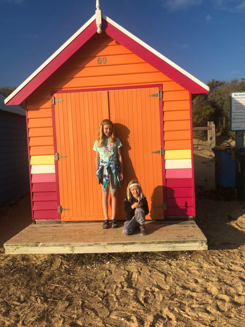 Auntie Cathy arrived this morning and we took her to the beach to get sunshine and show her the beach boxes. The kids wanted to pose with some of them.