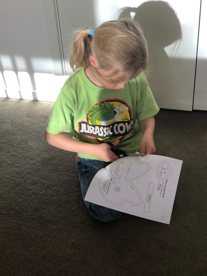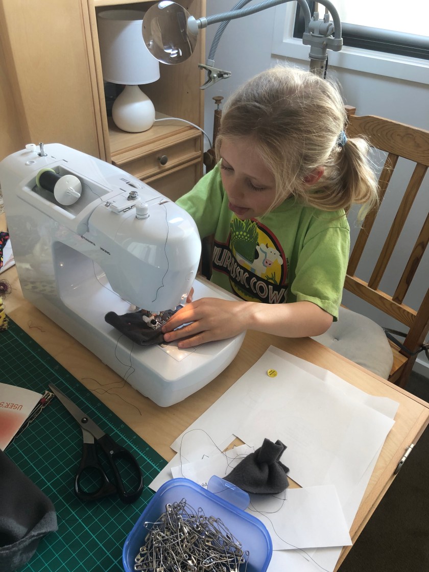 Colin wanted to do a sewing project, too, so we have started on a little stuffed cat. so far we have made the ears and tail, and cut out one of the body pieces.