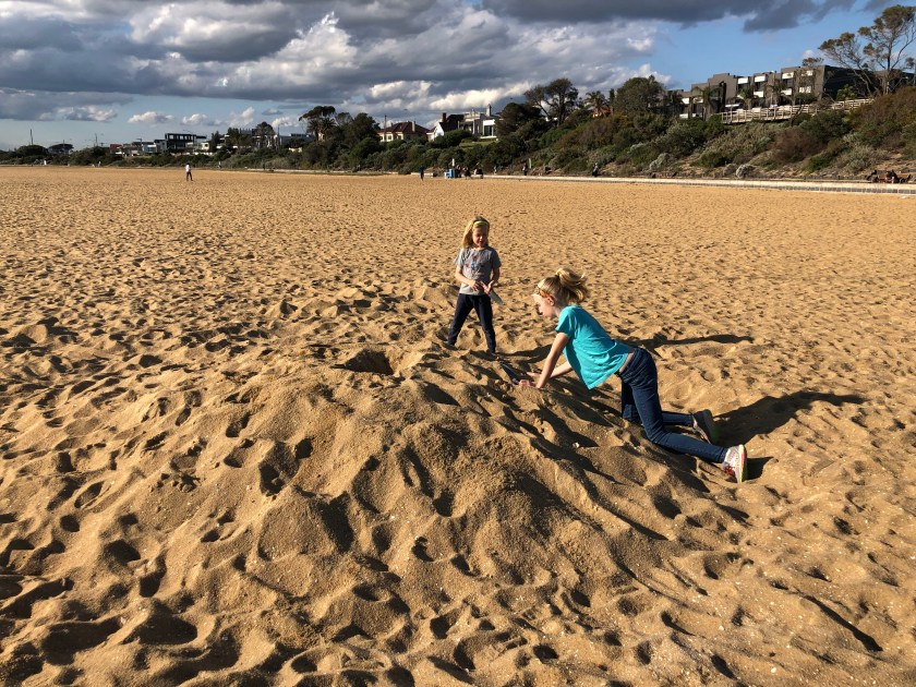 We enjoyed a picnic on the beach for dinner last night. We set up next to a big pile of sand, because I figured the kids would enjoy it. I was right.