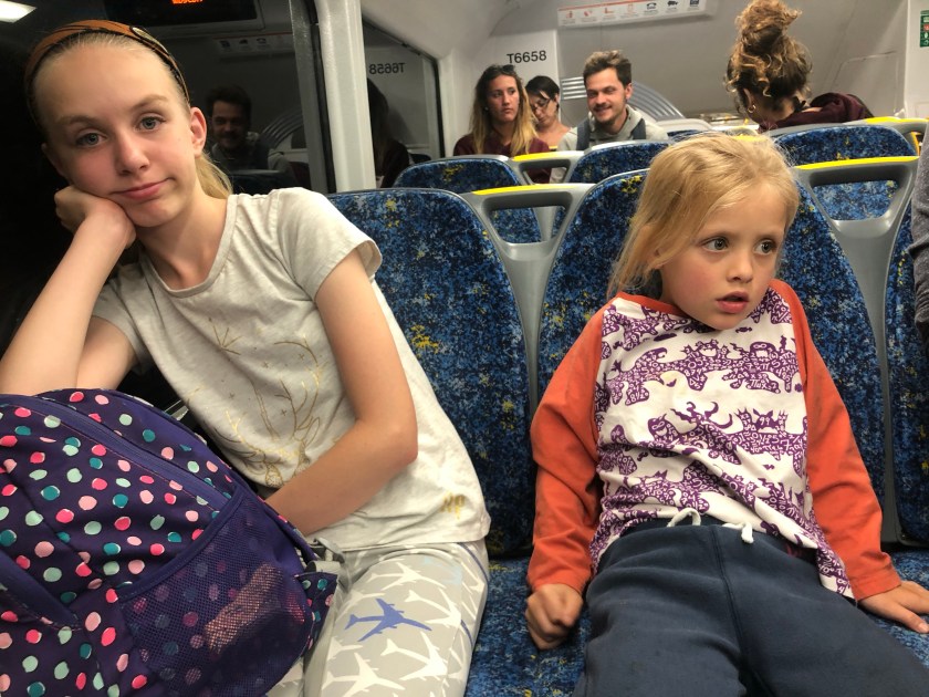 We have come to Sydney for a couple of days. Laura has a dress rehearsal for her dance recital all afternoon, so it was an evening flight. Kids are pretty tired out on the train into the city (but enjoying being on the top of a double-decker train!)