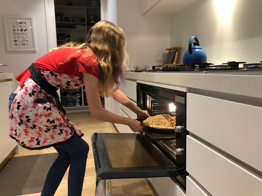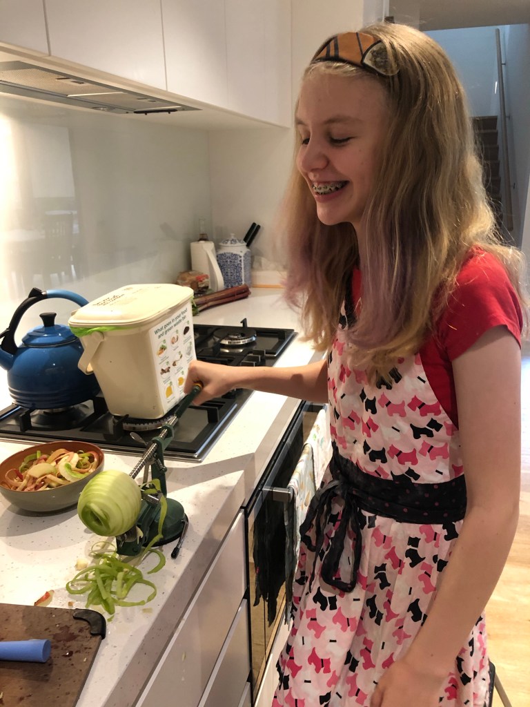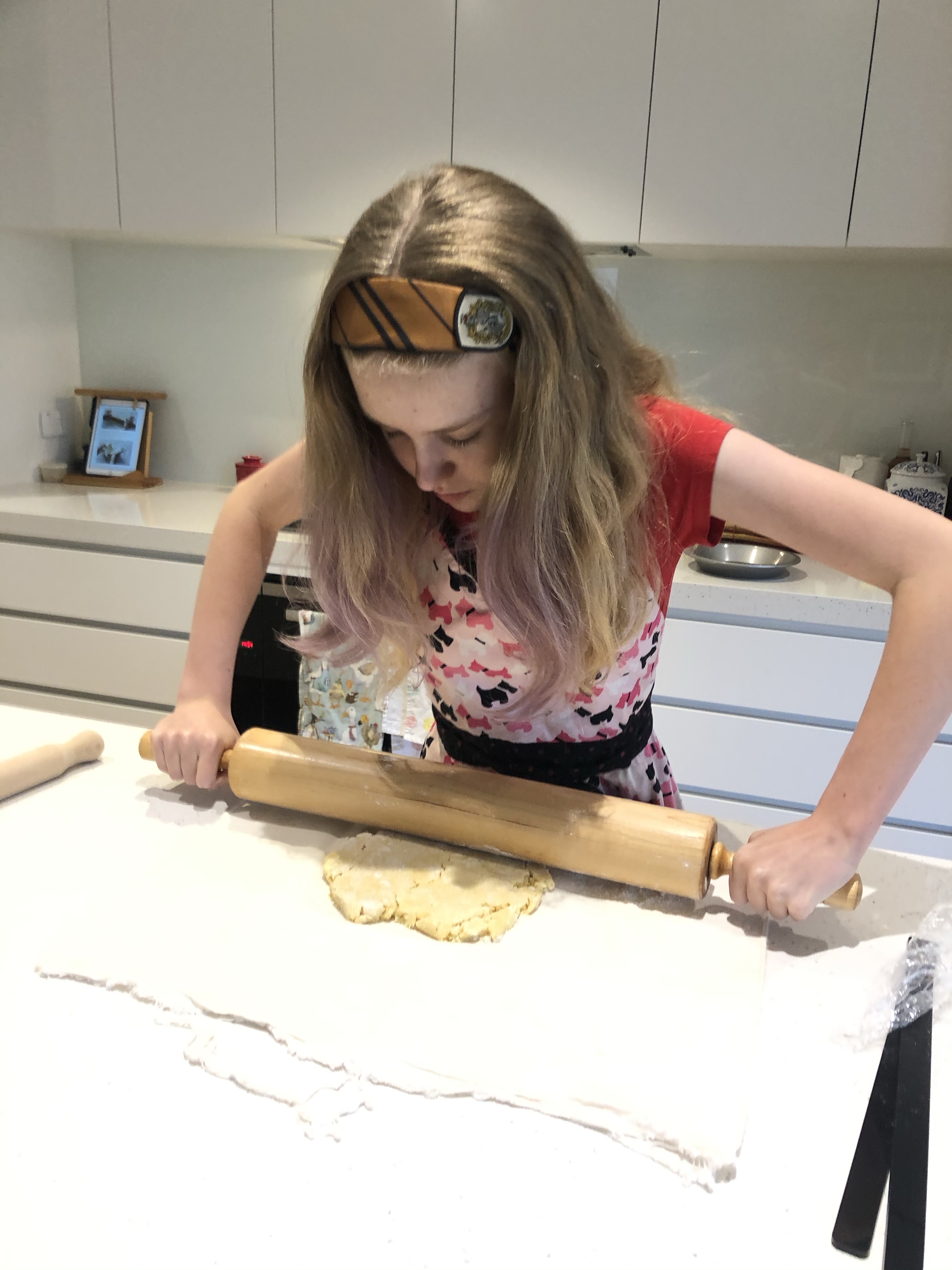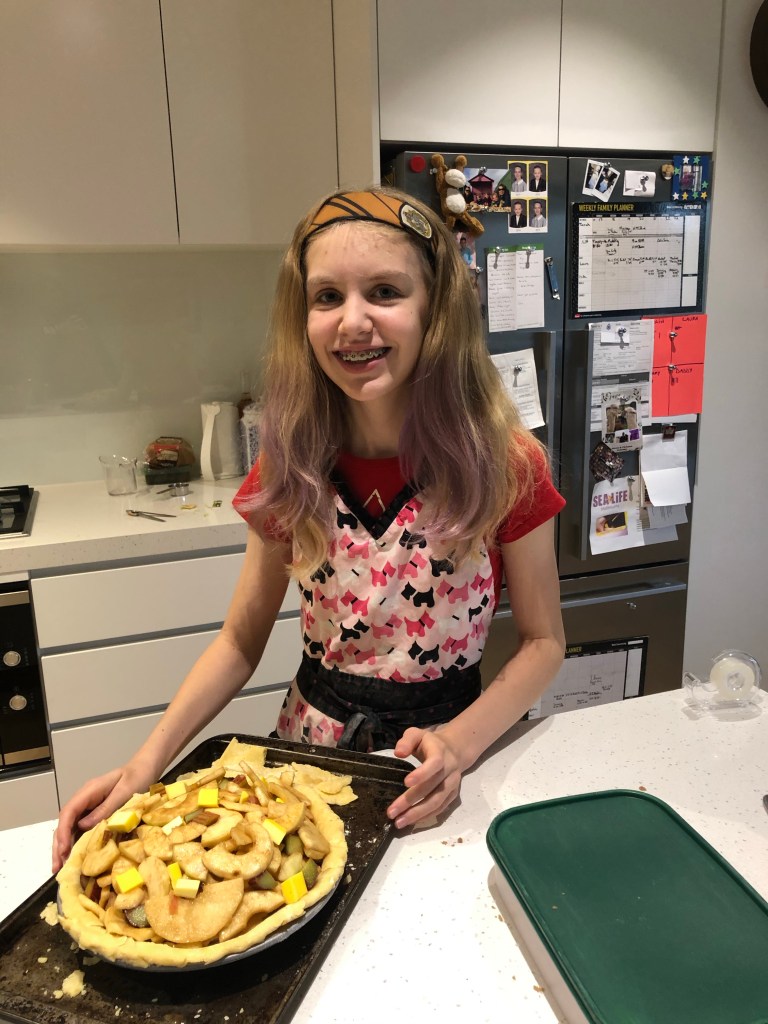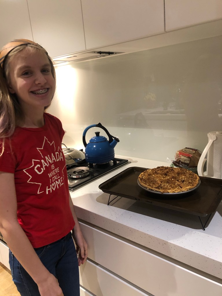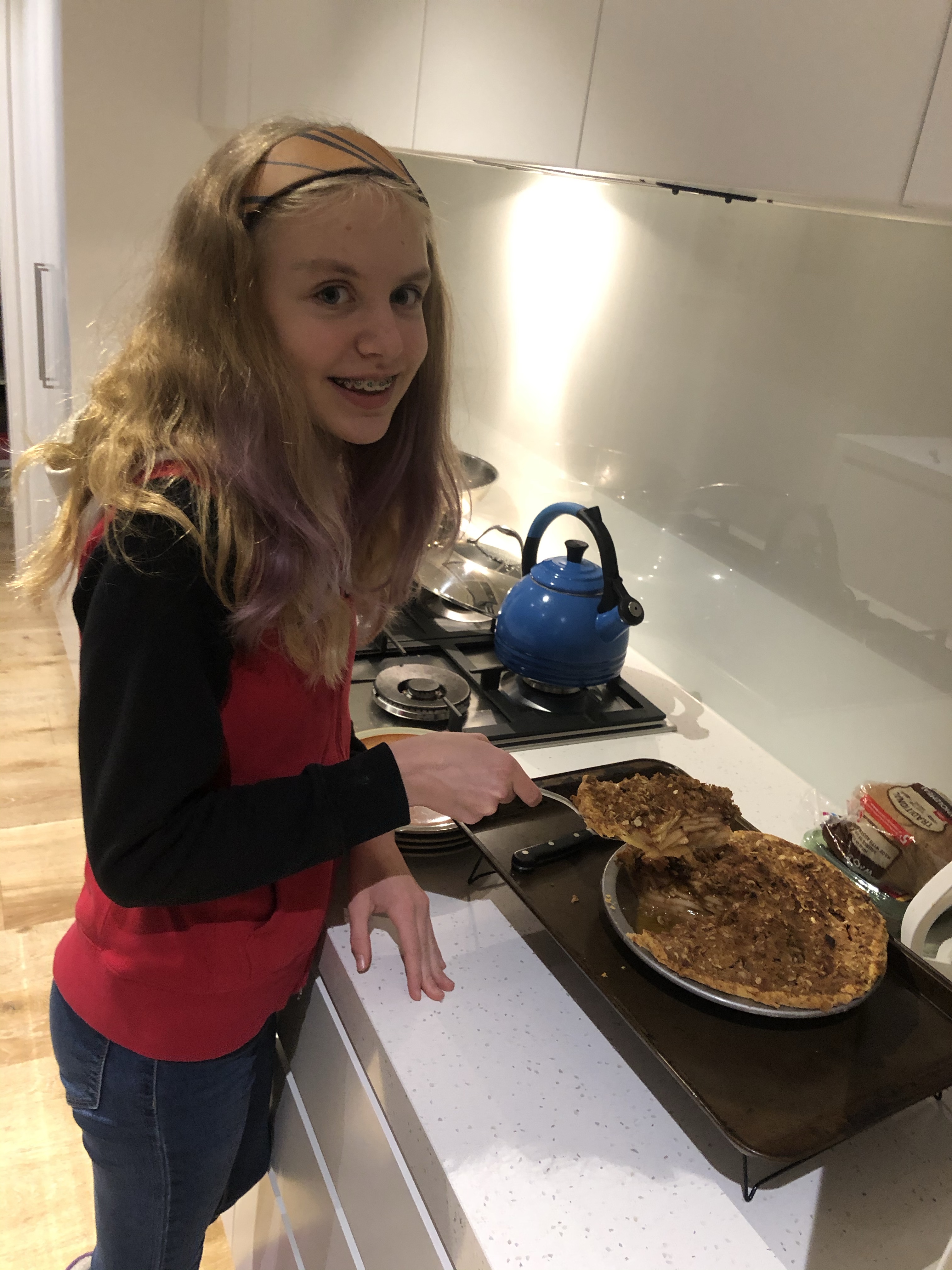 Laura’s third week of “baking basics” involved a rhubarb-apple crumble pie. It took her a long time and she learned a lot! And it’s delicious! her very first pie is a success.