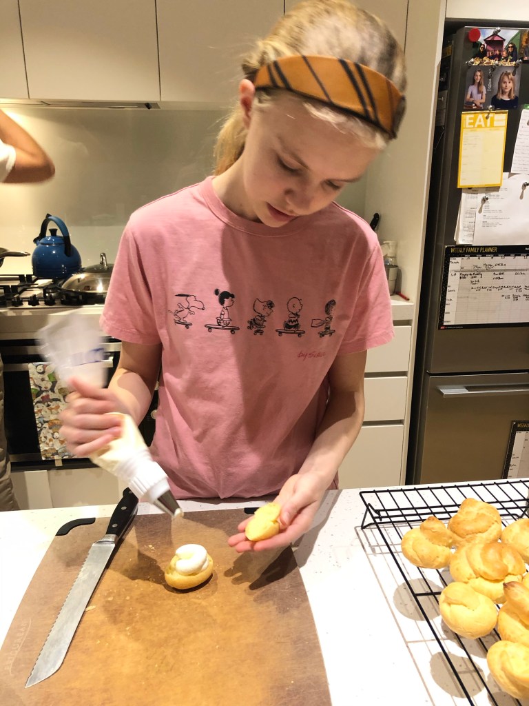 Laura’s baking project last weekend was cream puffs, involving choux pastry. Her piping work needs a bit of practice, but they tasted great!