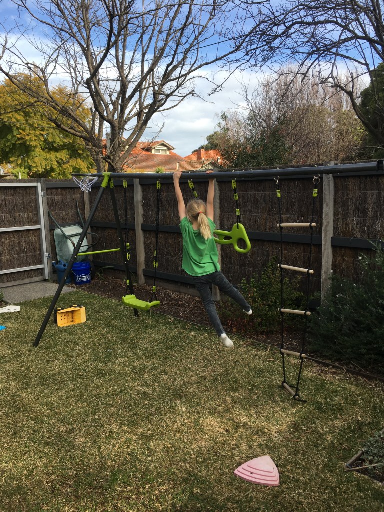 Colin is getting lots of use out of the backyard swing set. I’m not sure why I put the accessories on it. He is happy enough using the top bar to get from one end to the other.