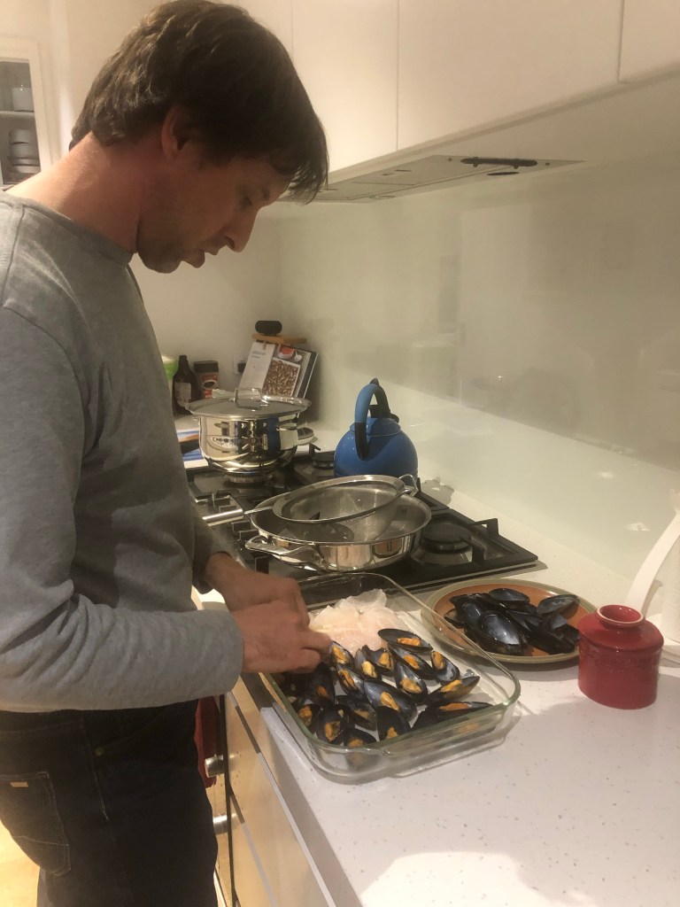 We tried a new recipe Friday night – tomato soup served with mussels that are baked with a cheesy breadcrumb topping. Cliff did a great job making them!