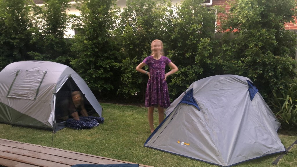Camp out! The kids decided to take their new tents from Grandpa out for a spin in the backyard tonight. Poor quality photo as the sun was setting and the kids wiggly. Share this: Click to share on X (Opens in new window) X Click to share on Facebook (Opens in new window) Facebook Like Loading... Related