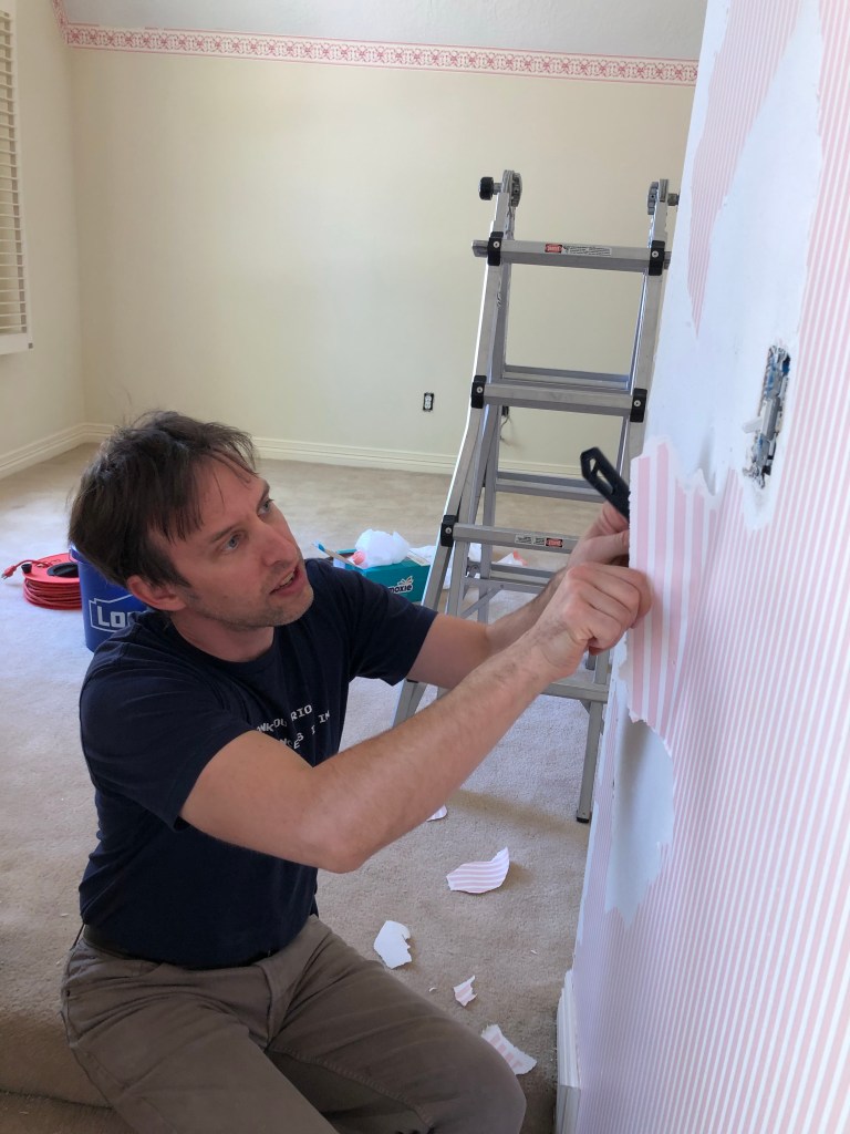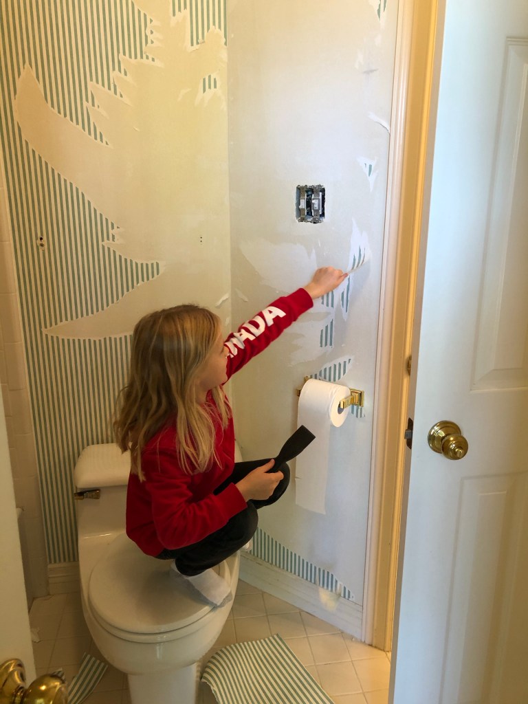 Step one is removing all the wallpaper. There is a LOT of it, and two layers thick in some places. Thankfully everybody is helping.