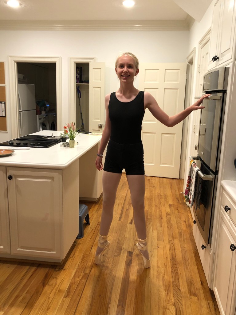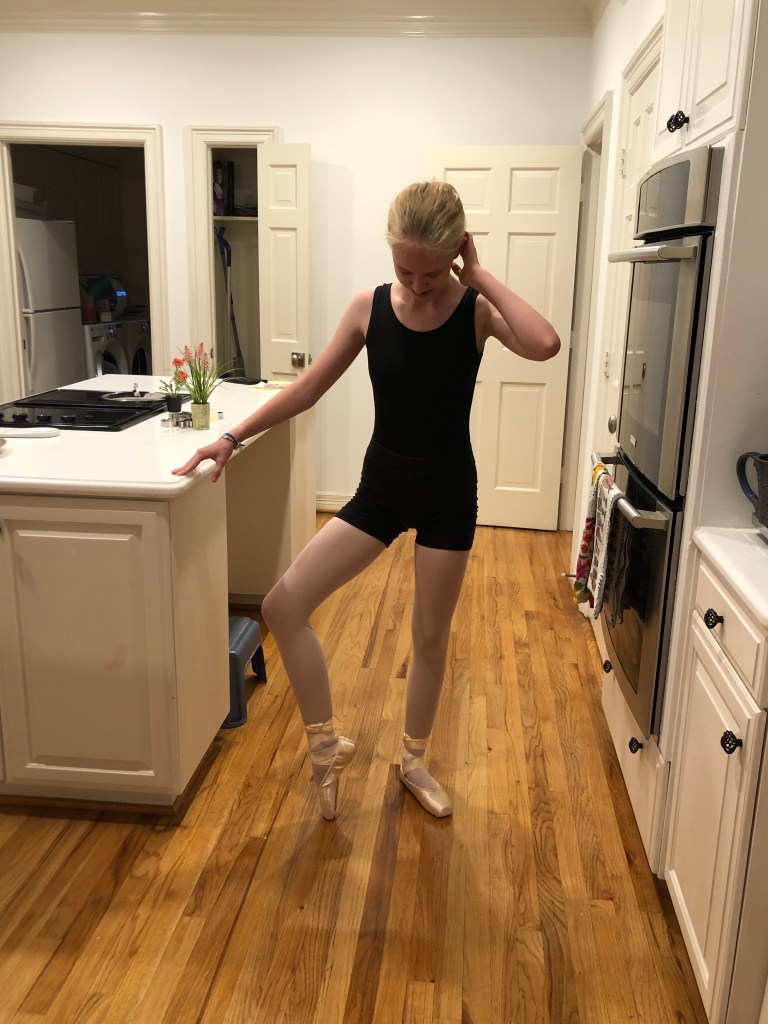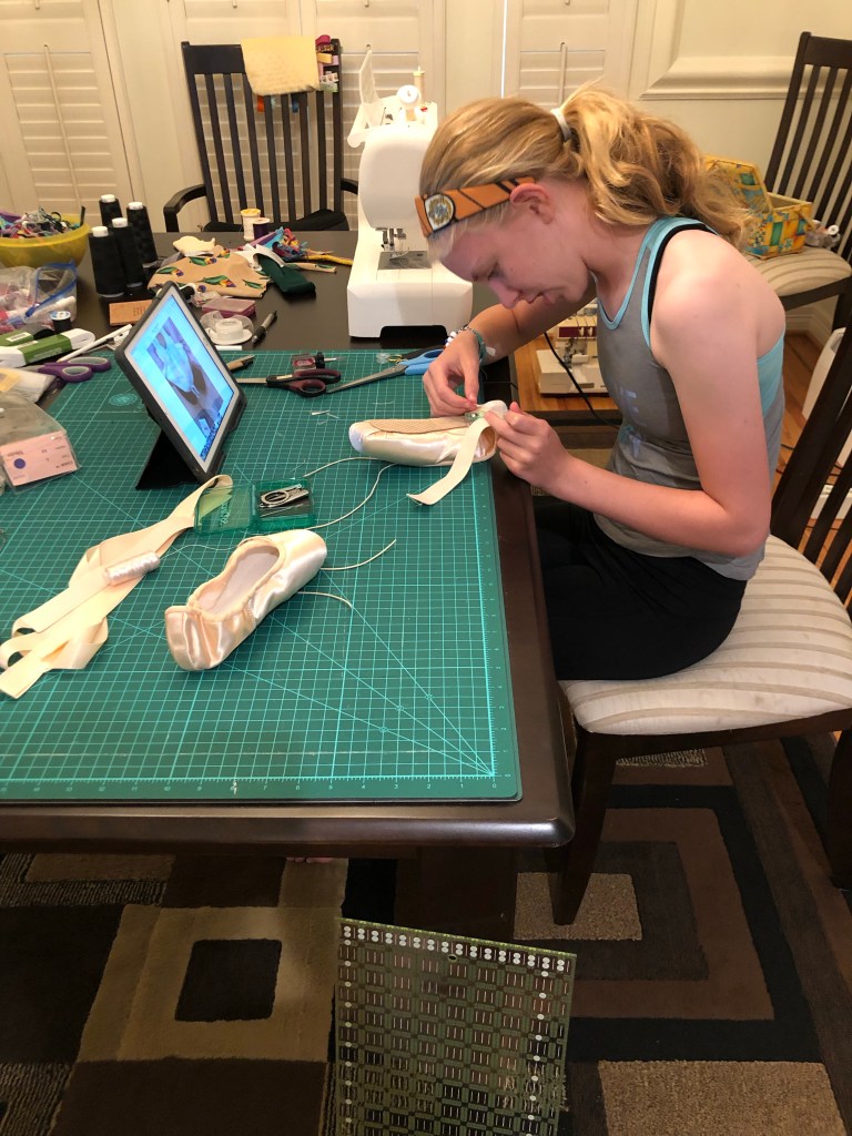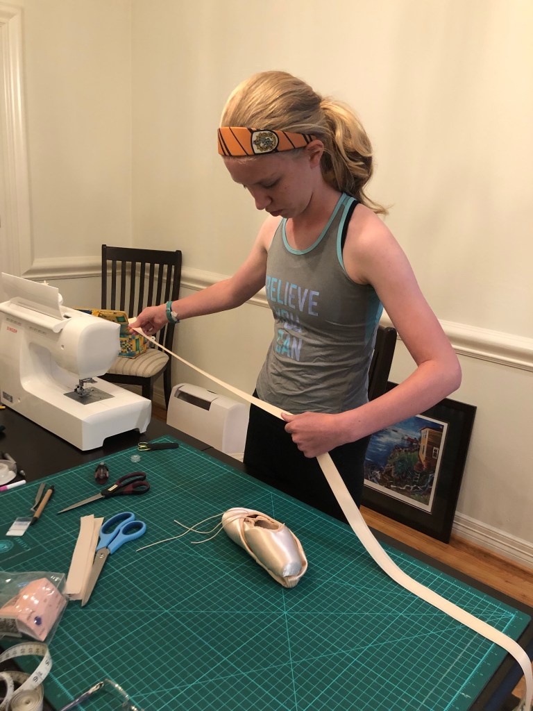 Laura did not know that pointe shoes are all personalized, and it’s the dancer herself who has to finish them! She had to hand sew elastic and ribbons on to the shoes.
