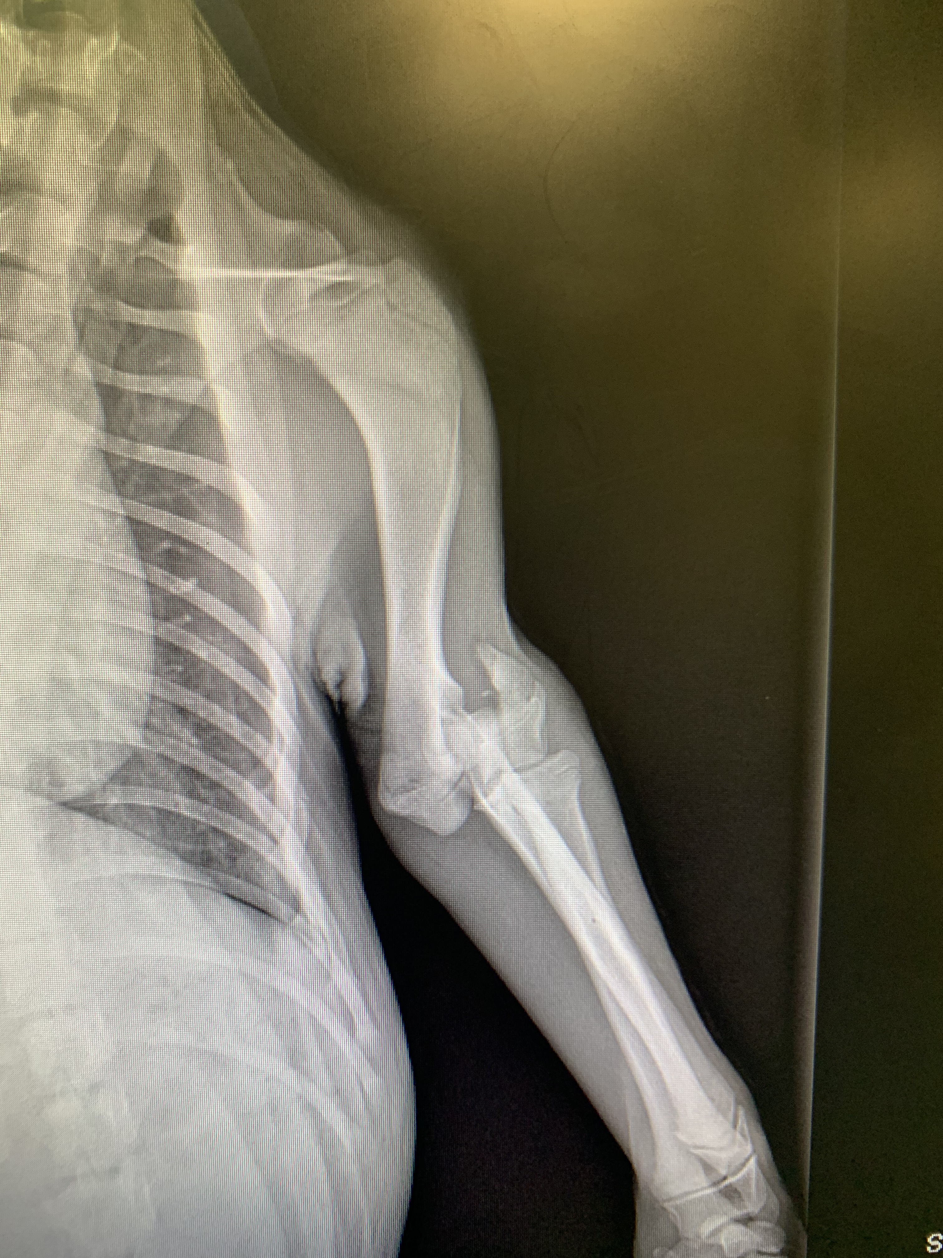 She had no identifying marks and seems to have been feral for most or all of her 4 month life. She was in bad shape and had fleas, ticks, intestinal issues, and a badly broken elbow.