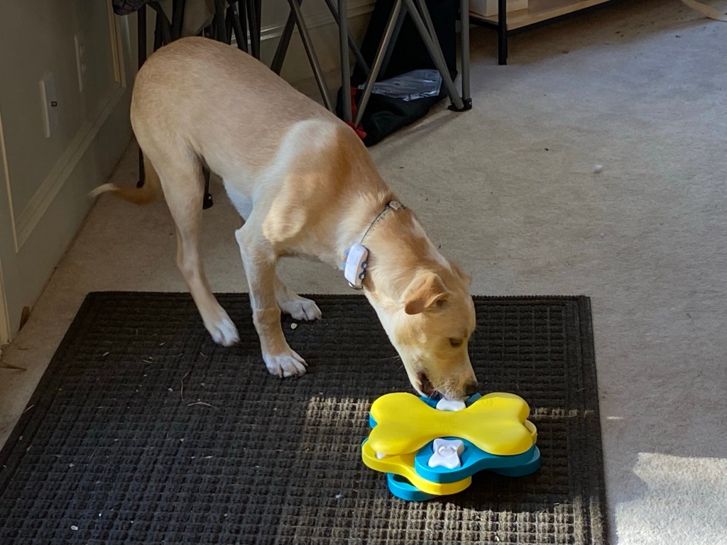 One of the ways we are training Pancake is to give her challenges to solve. This busy box with lots of hidden treats kept her going for a while. It has bits to lift and bits to rotate, and she was determined to get all the treats out.