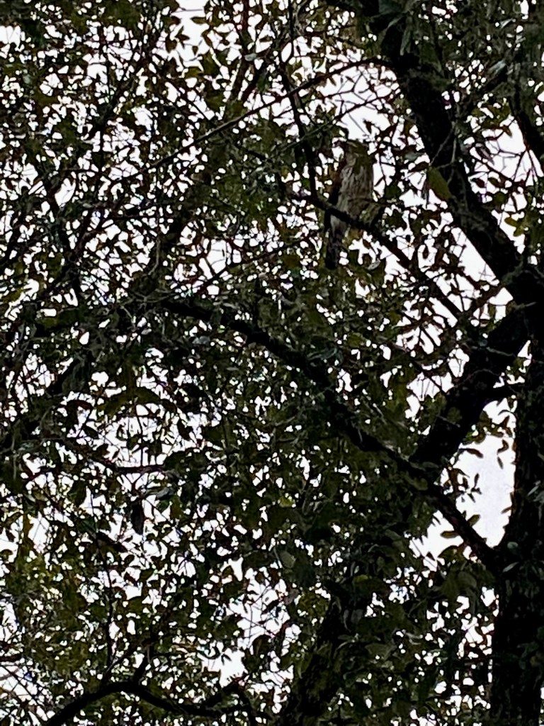 Our reward was seeing a sharp-shinned hawk! This is a terrible photo (near sunset, in the rain, using only a phone) but it was a treat to see it!