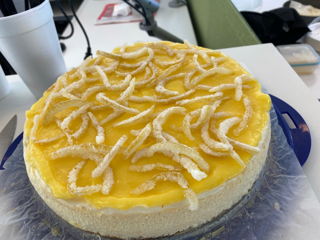 I made a lemon cheesecake to celebrate a colleague’s birthday. I was particularly pleased with how the candied peel turned out.