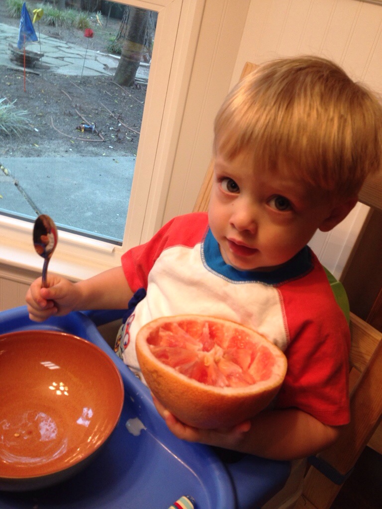 Giant grapefruit Colin loves to “eat” grapefruit. Really, he likes somebody else to eat it, and then he loves to squeeze all the juice out. He drinks it all up! Today’s fruit took some extra hands.