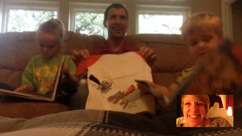 This is what it’s like attempting to call home while I’m away. The kids are either manic, or would rather read books than talk to Mommy. So the adults talk about kid stuff while they just do stuff in the vicinity of the phone and yell, “Hi Mommy!” from time to time.
