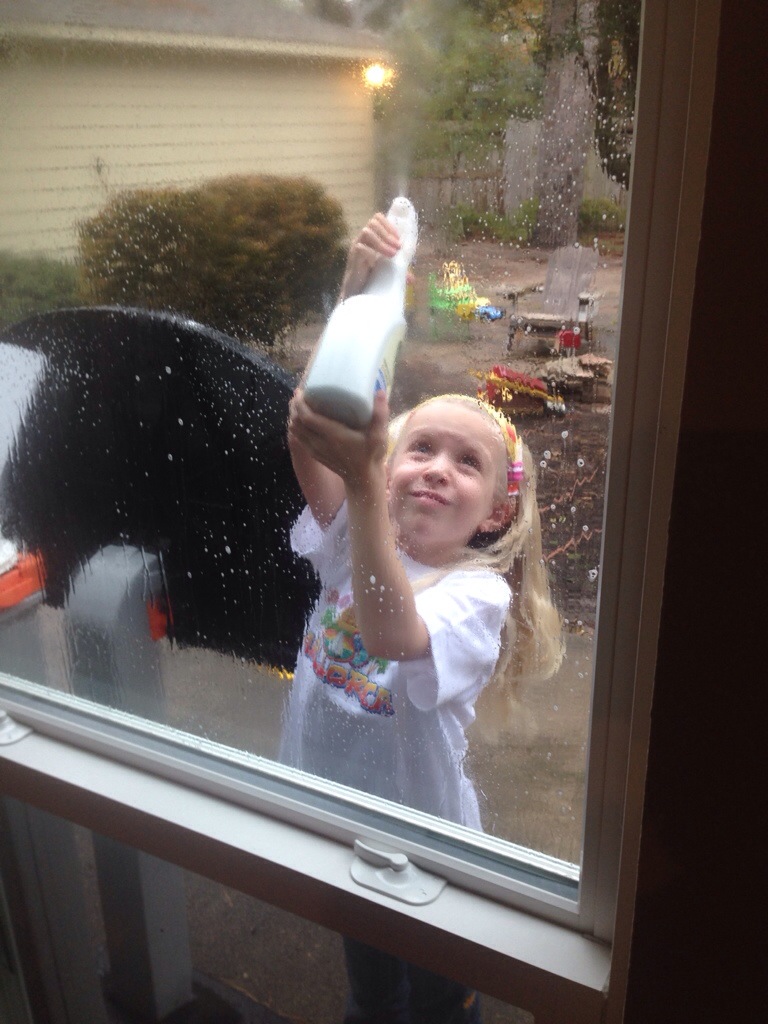 Afternoon at home with Daddy! This is what happens when Daddy’s in charge for the afternoon! Actually we’re cleaning the windows to put bird avoidance stickers on. Lots of bird strikes recently.
