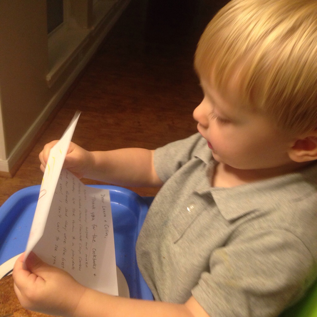 Thank you cards arrive. Colin is reading the cards from Will and Mary out loud. They seem to be about happy birthday parties at our house and blowing out candles.