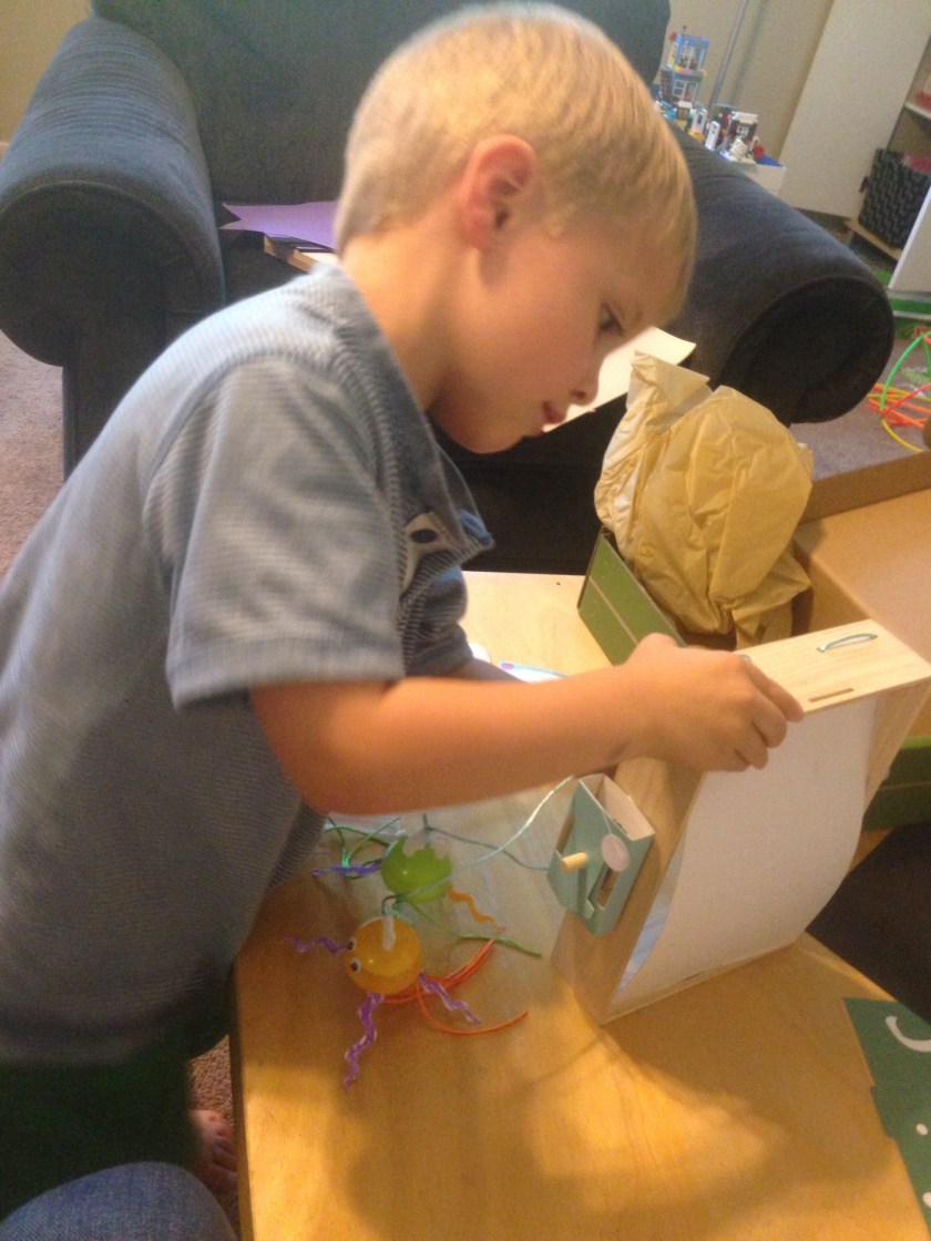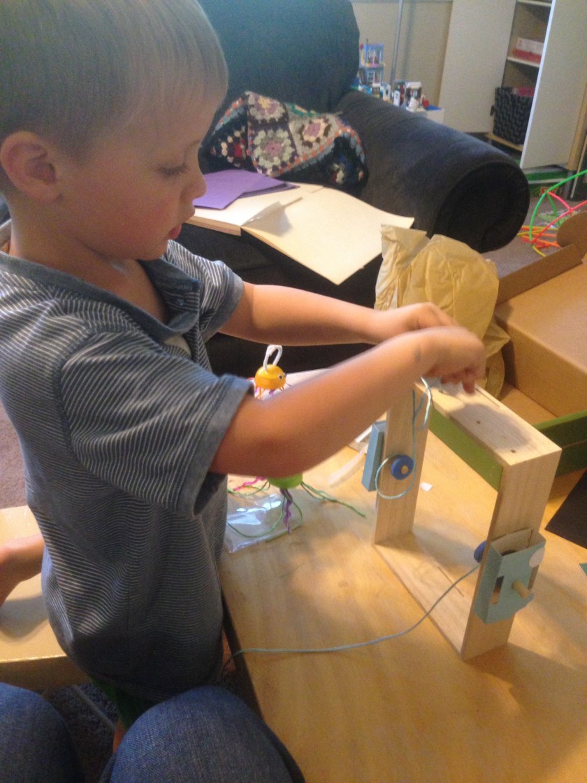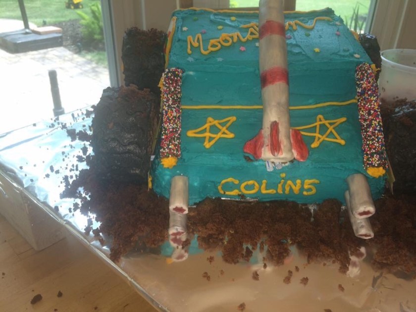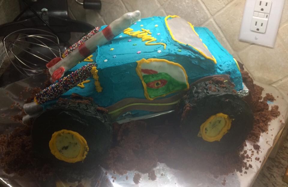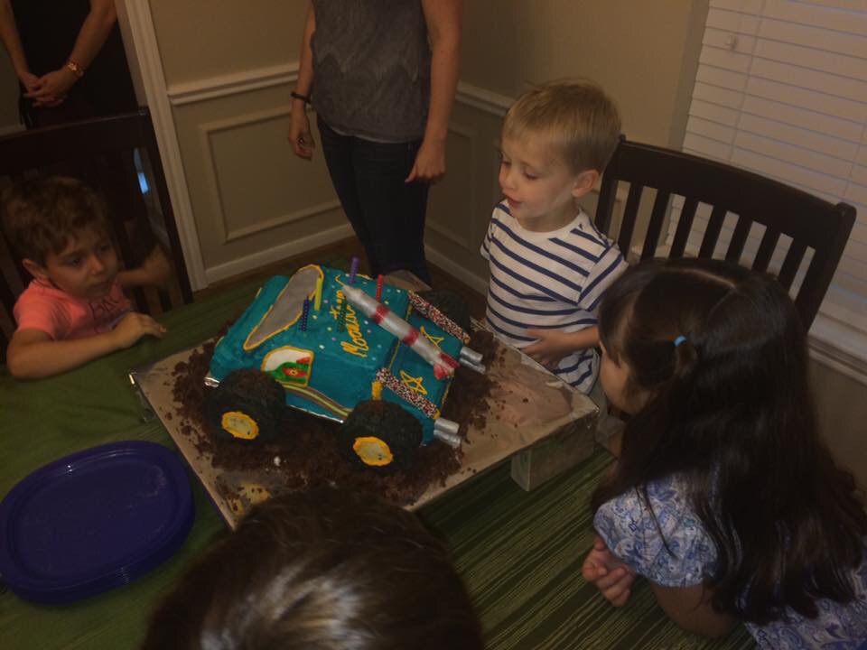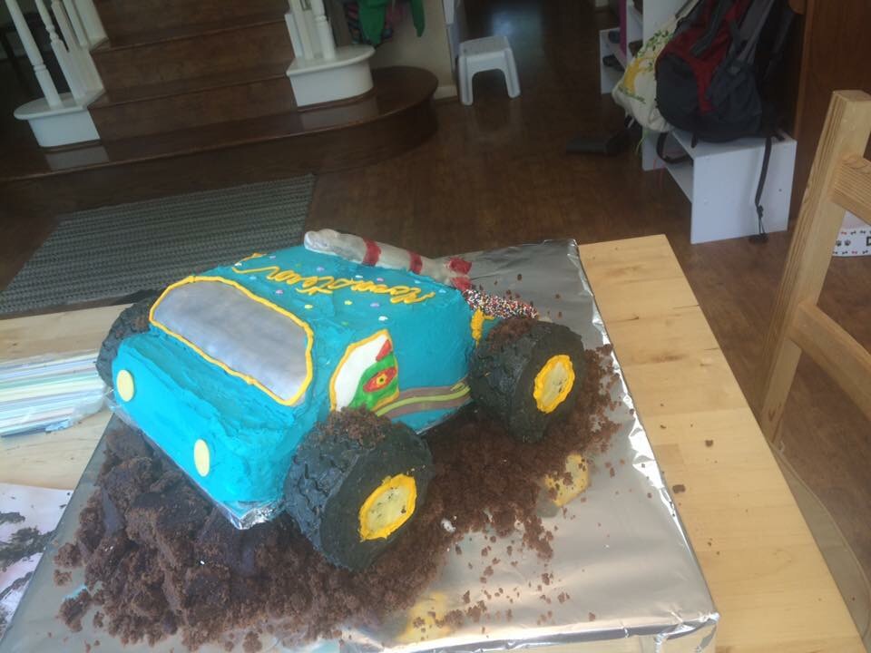 It’s a monster truck, being driven by his favorite monster truck (Dragon). The truck’s name is MoonStern and it has a rocket on the top so it can fly to the moon. It had to be blue. And it’s doing a wheelie over a pile of dirt, of course.