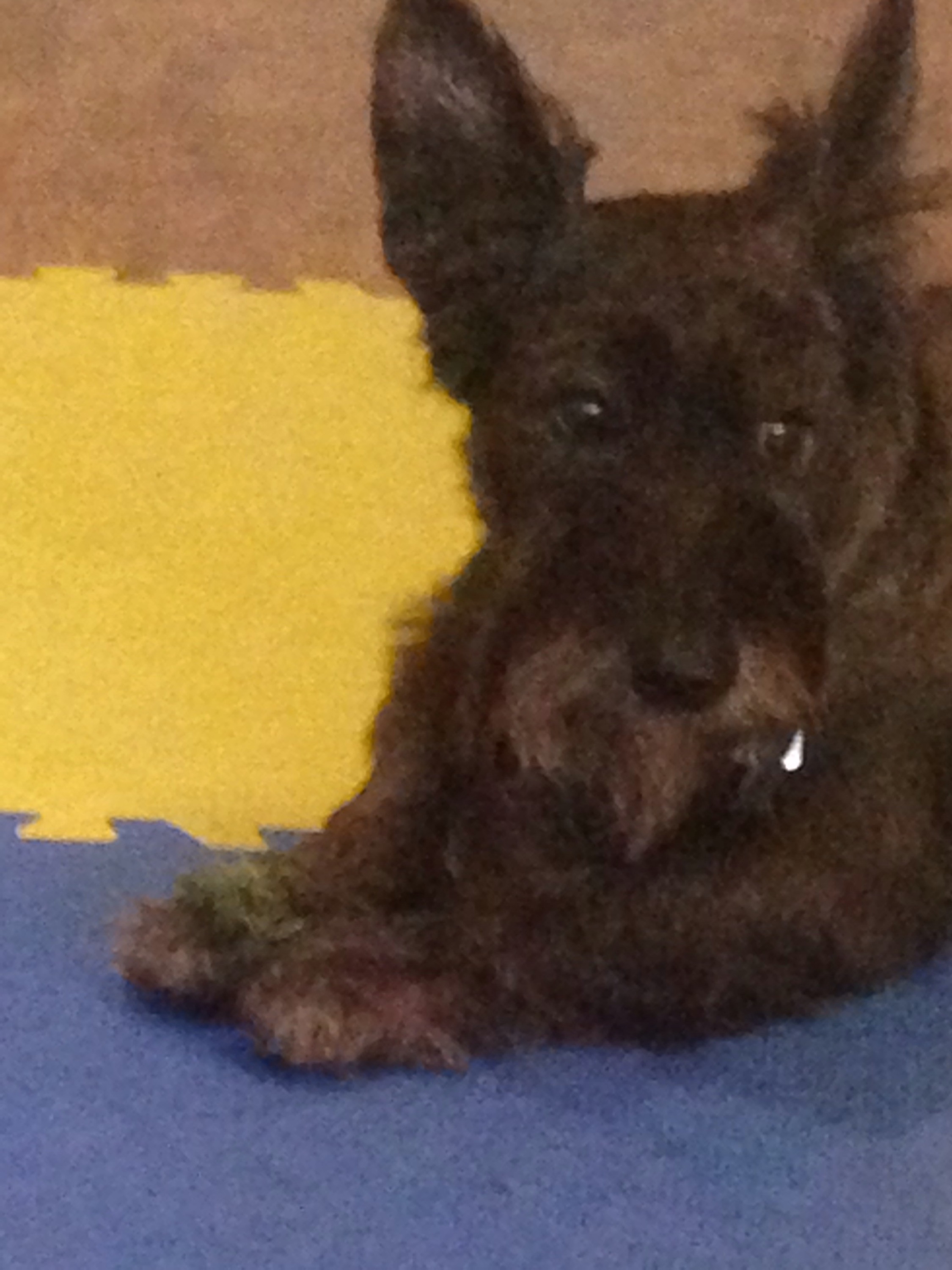 The dog is confused about why there is a tree inside and isn’t sure if he’s allowed to play with the pieces that were trimmed off. (If you look closely you can see the twig between his paws)