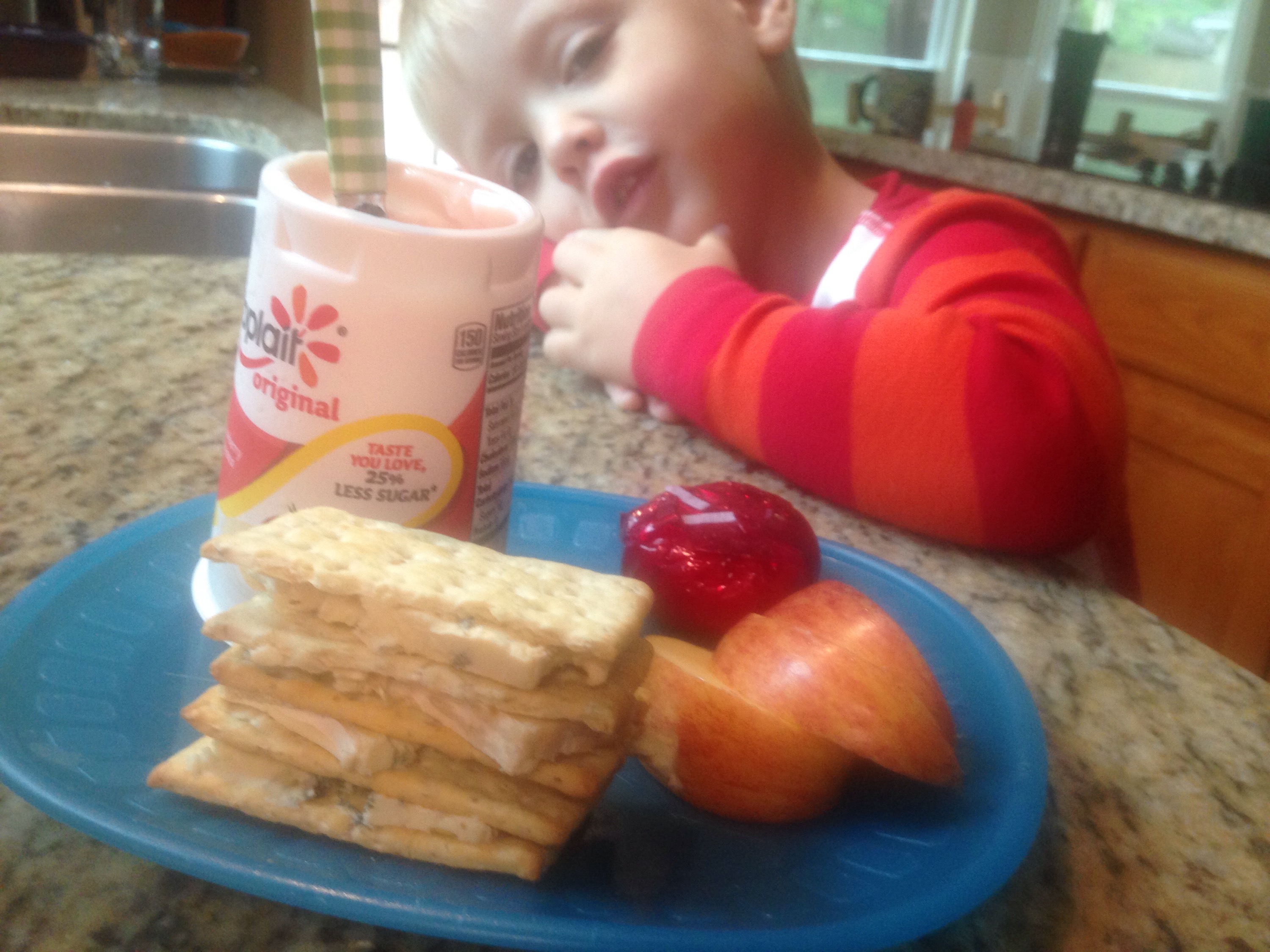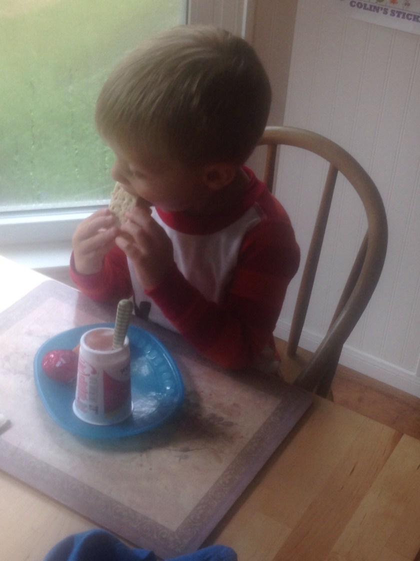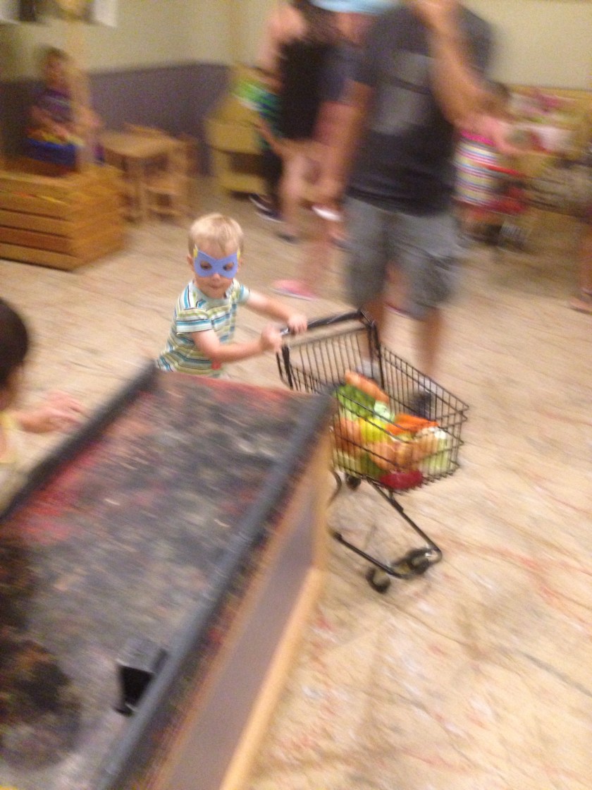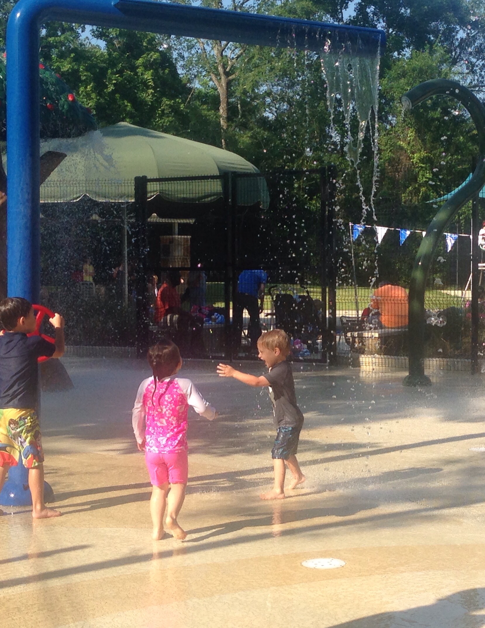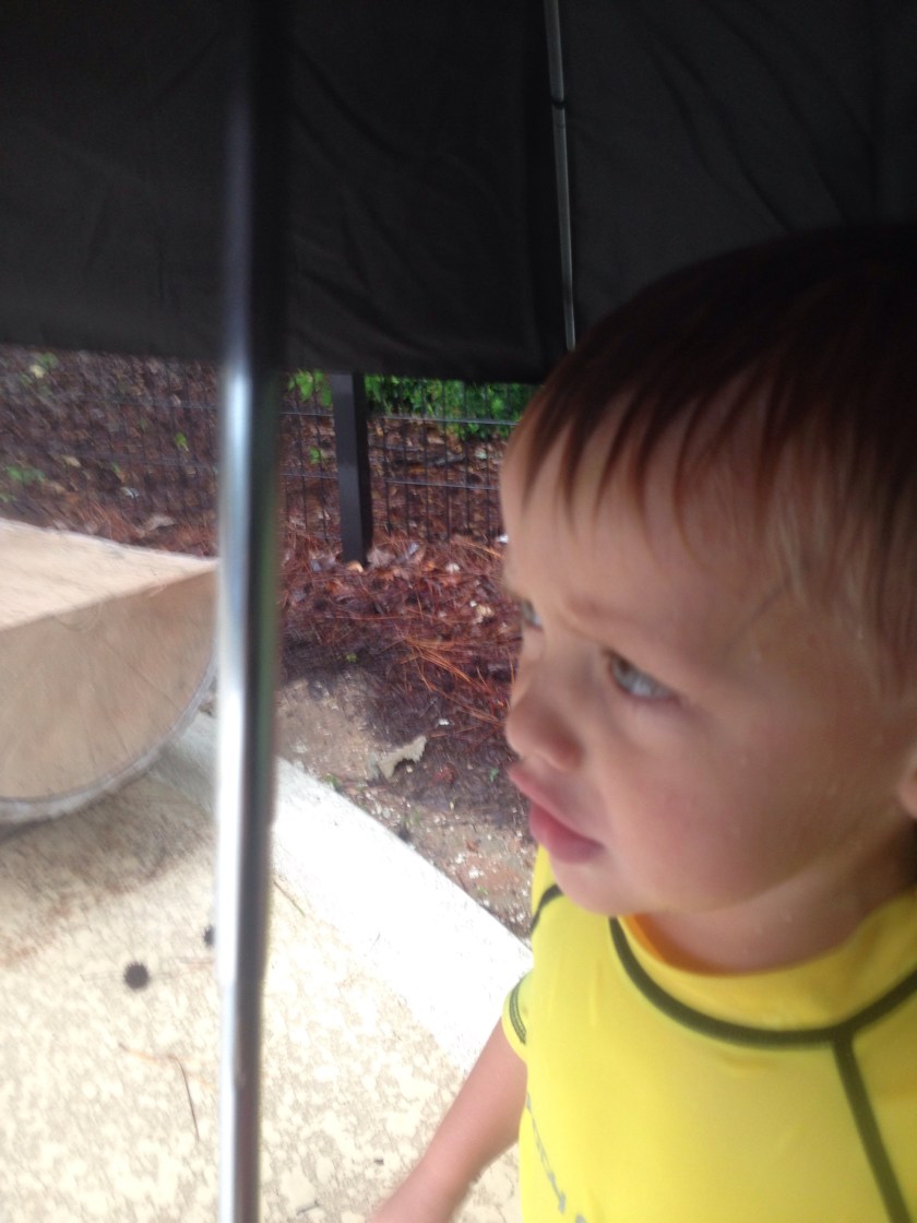 We got out to the splash pad this morning to burn off a bit of energy. Colin decided that, between spurts of running through the water, he had to hide under the umbrella with me to stay dry from the rain.