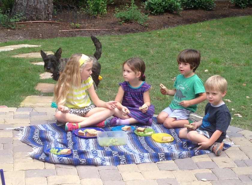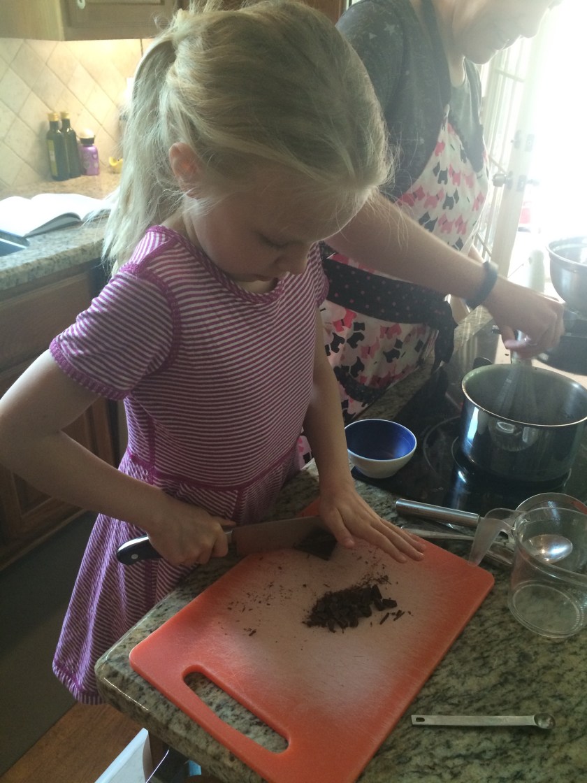 Laura is very proud that she is now experienced enough in the kitchen to be able to use one of the big knives. She chopped up the chocolate to make the fudge ripple in tonight’s ice cream.