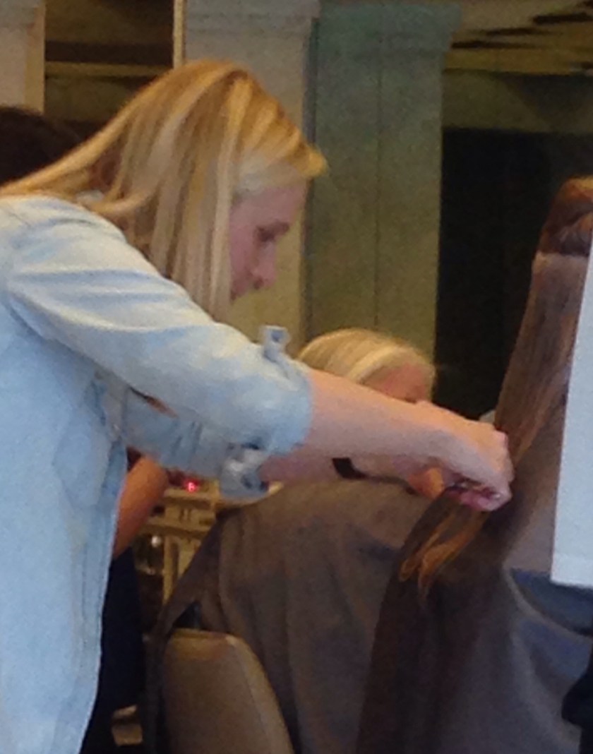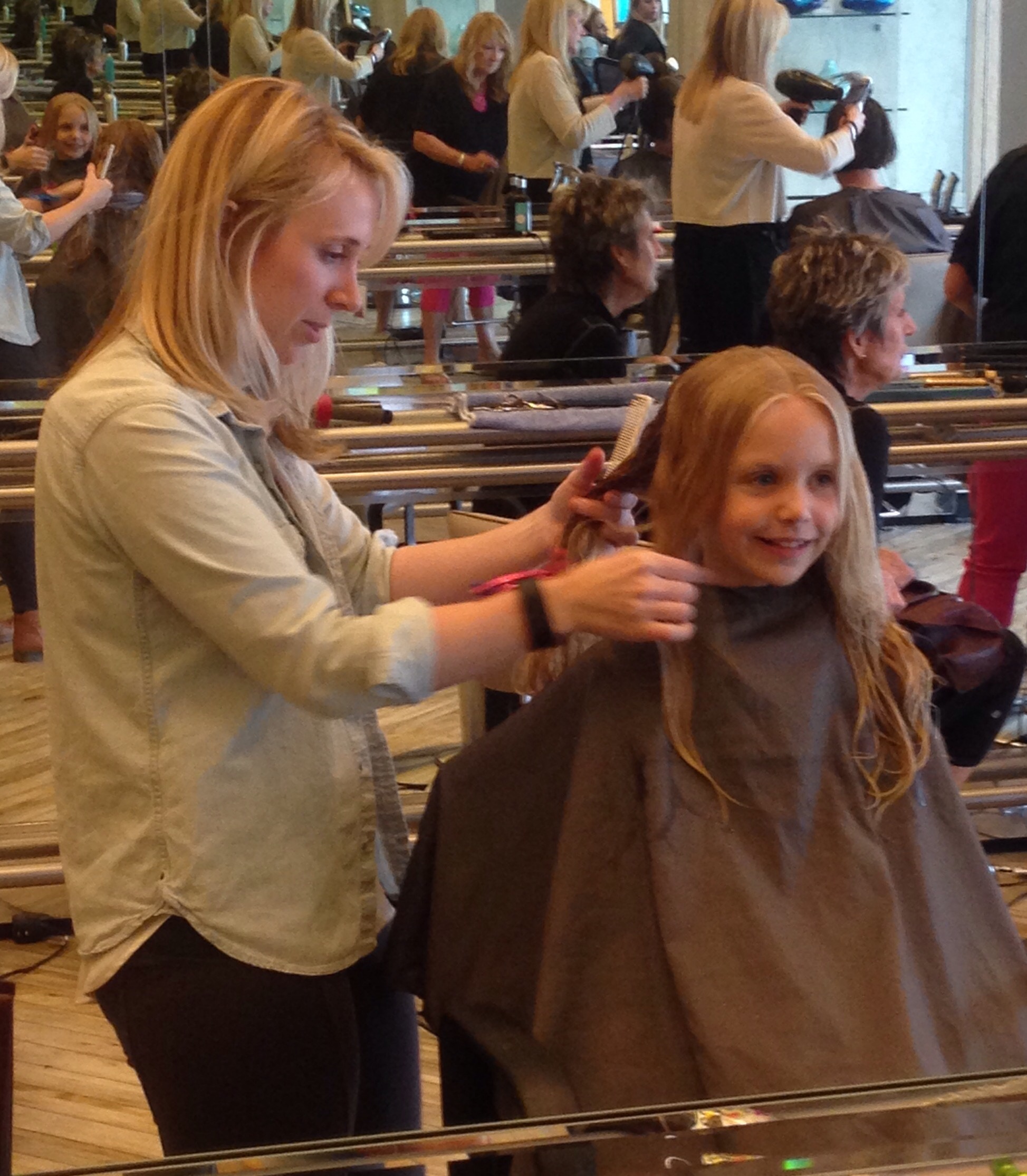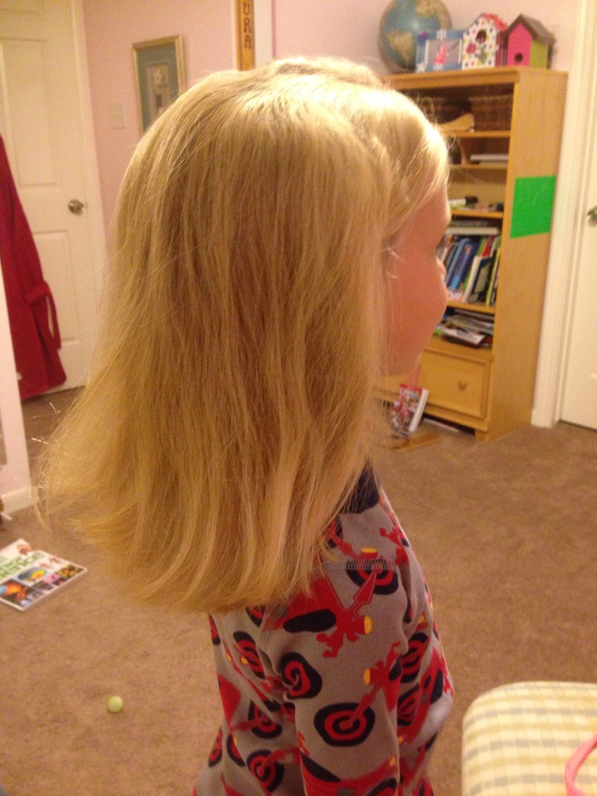 Laura got a haircut yesterday. With about 6″ taken off it still goes into a bun for dance and is still past her shoulders. It should be much lighter for summer.