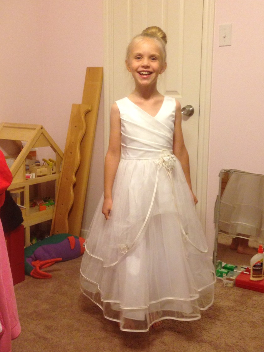 Laura is to be a flower girl at a cousin’s wedding this fall. Her dress just arrived. When Laura saw it she wanted to know if it was her wedding dress.
