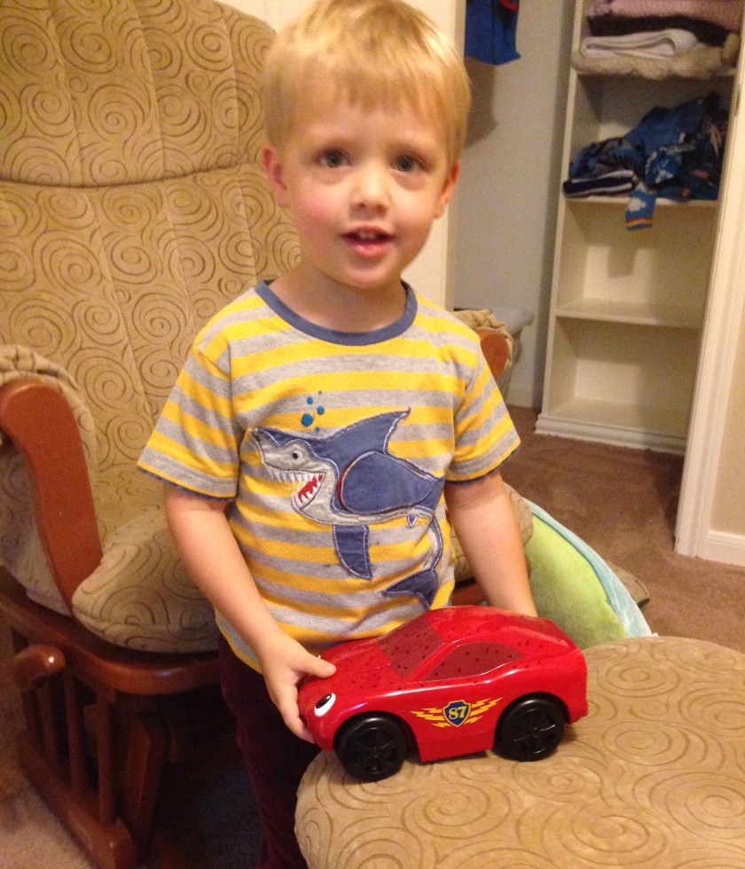 Thank you Aunt B-A and Uncle B for the new night light for Colin. It projects stars and lightning bolts on the ceiling. He think it looks just like “Lightning The Queen” from the movie.