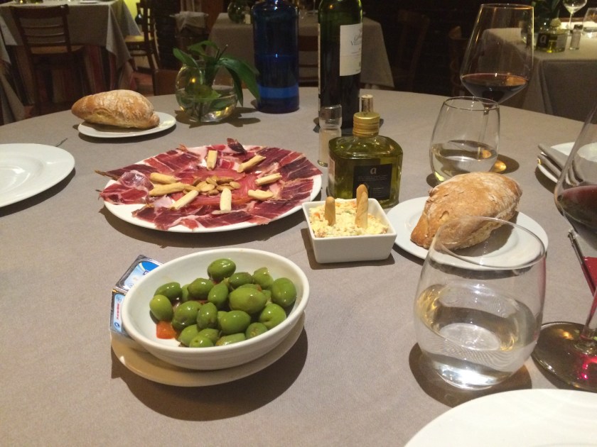 These were our starters for supper in Madrid. The bread was delicious and crusty and the olives had a lovely bright flavor. Naturally there was jamon (Spanish ham), and Rioja to wash everything down. Yum!