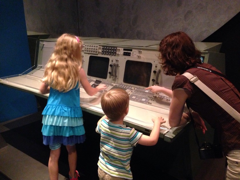 The lighting was terrible for taking pictures of the real space modules from the Mercury, Gemini, and Apollo missions. Though it was fun touching moon rock, meteorites, and playing with a section of the 1965 era control center. Houston, we’re having fun!