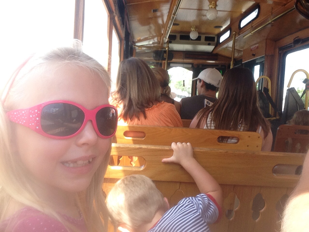 After a late start to the day and a quick trip to the Farmers Market, we spent the afternoon going for a trolley ride and a Waterway Cruiser ride. We then had a stop at the library, did some somersaults in the park, and got caught in the rain biking home. Now out for supper. Fun afternoon!