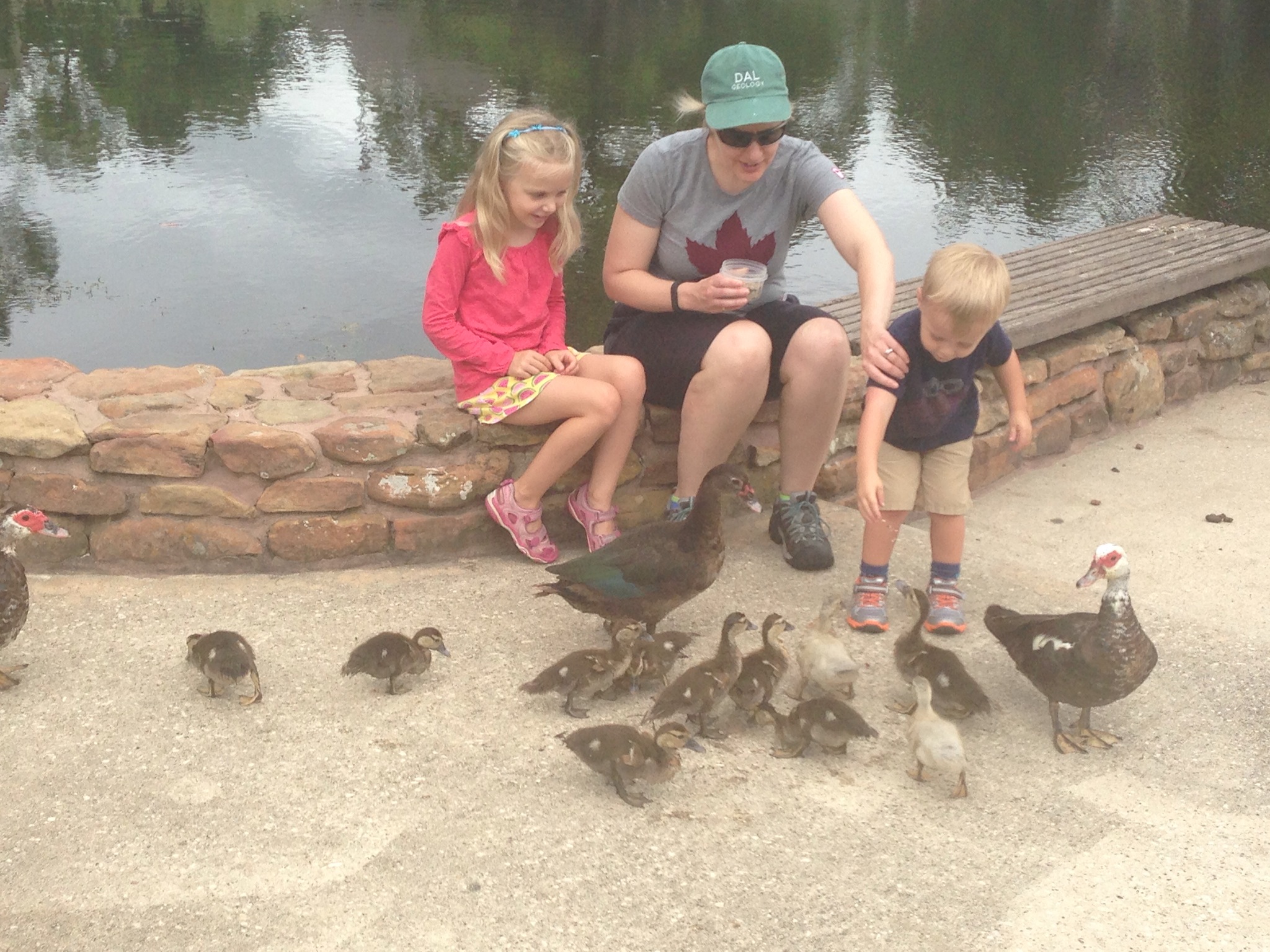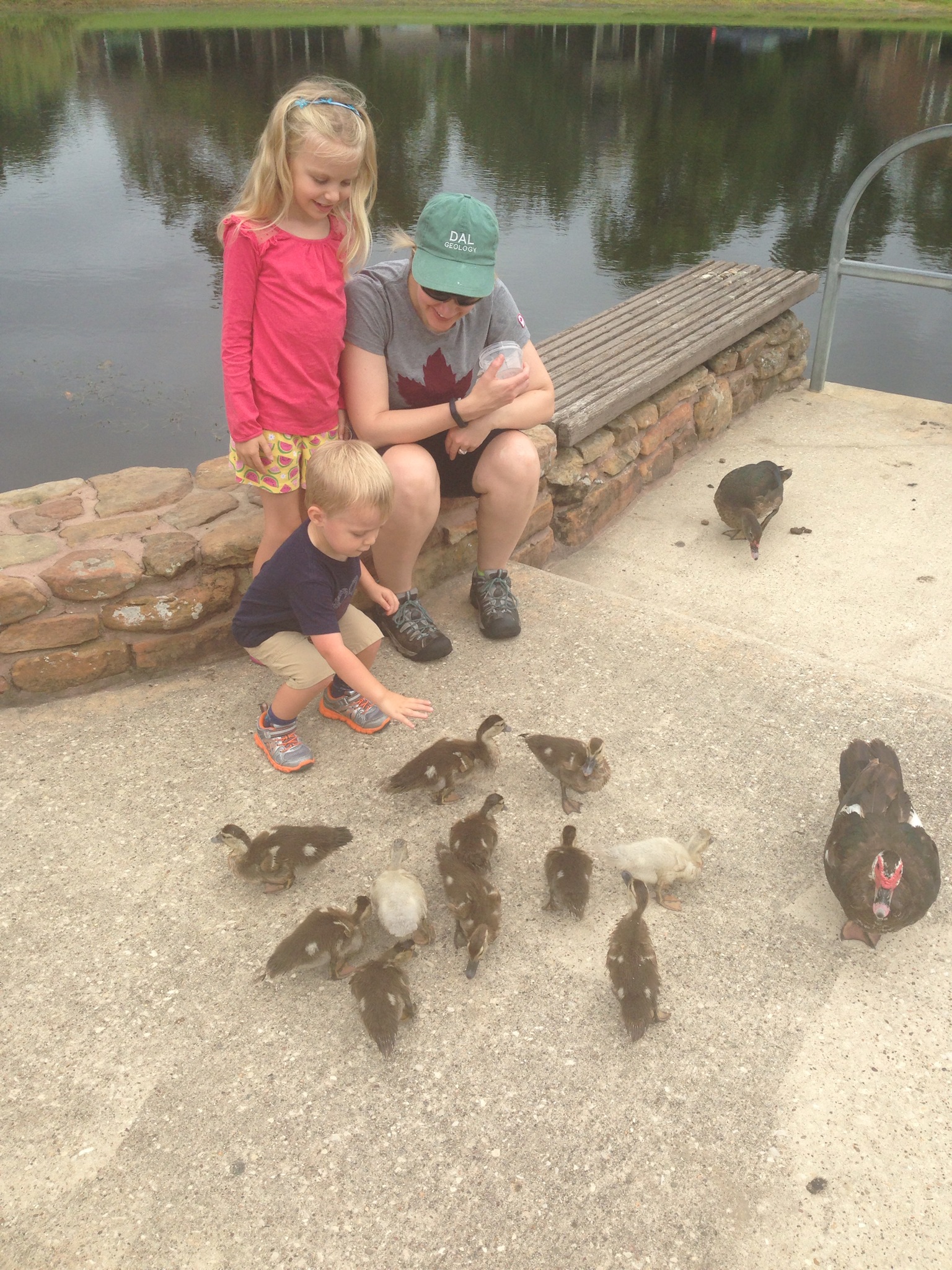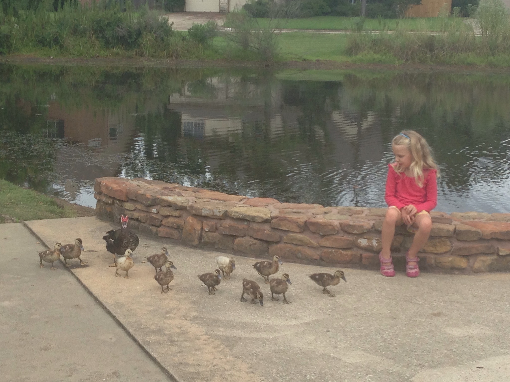 We have eleven baby ducks living in the pond near our house. We don’t normally feed the ducks, but we took a little bit of bird seed to them today.