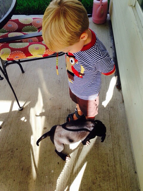 No, not ours. Colin got to play with this tiny Great Dane puppy at daycare today. He was very cautious around the small wriggly dog.