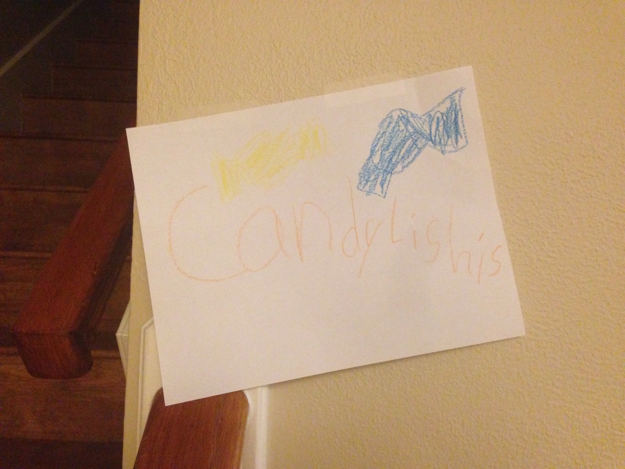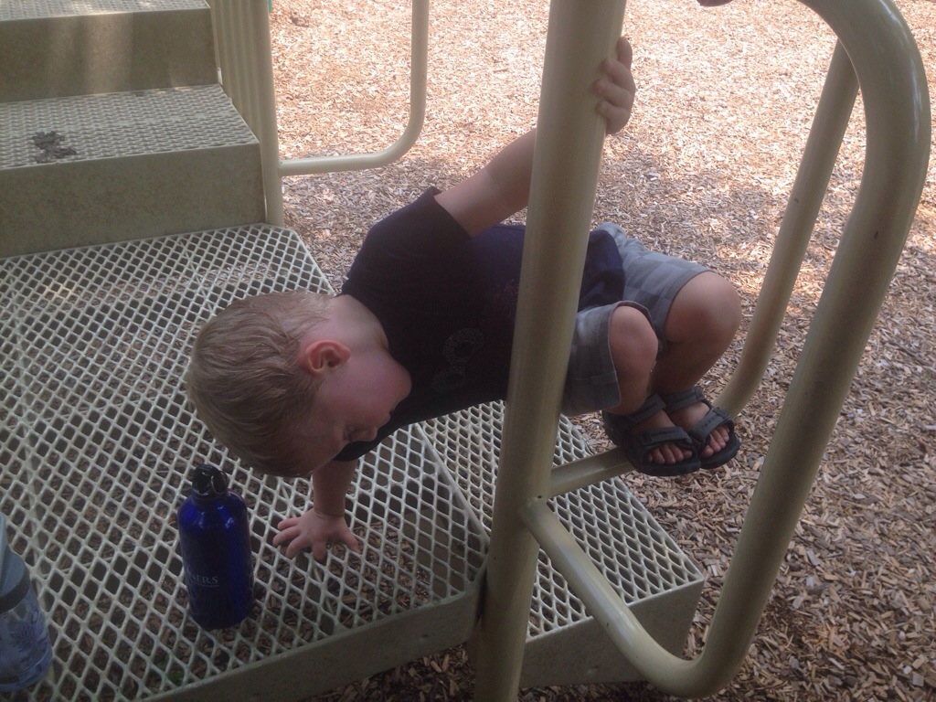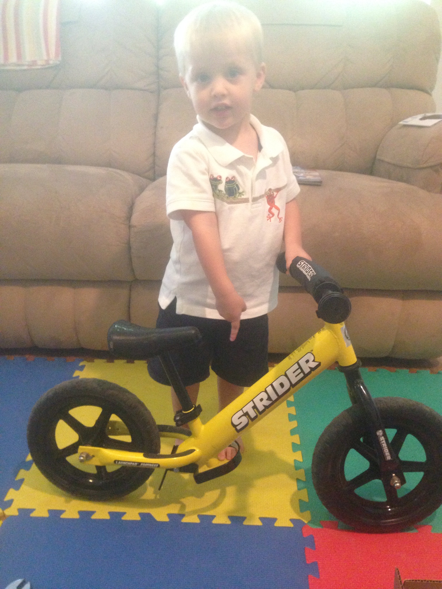 Colin showing off his new brakes on his bike He has learned to put his feet up and glide while I push between his shoulders. Now he can stop too.